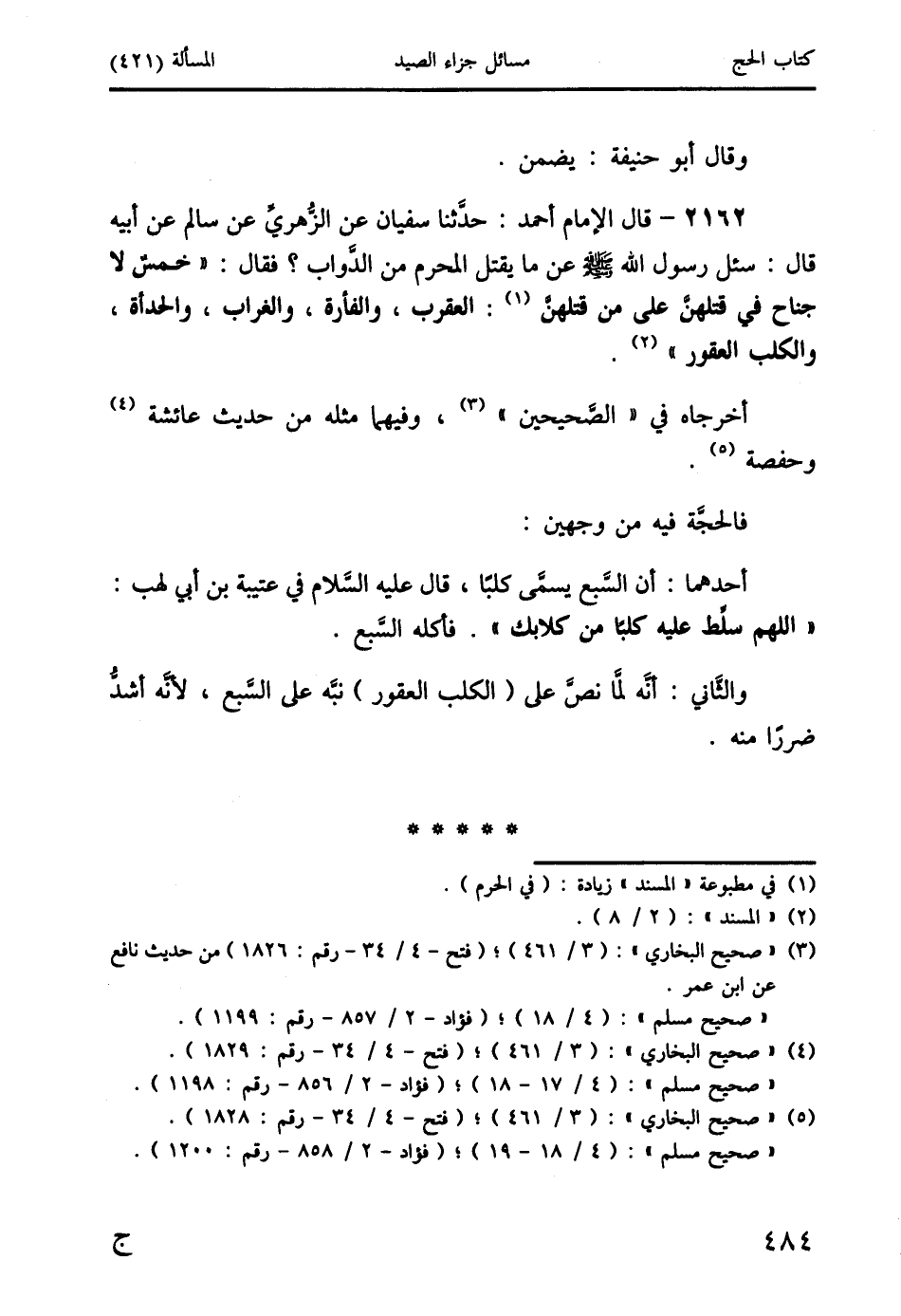 2162 - قال الإمام أحمد: حدَّثنا سفيان عن الزُّهريِّ عن سالم عن أبيه قال: سئل رسول الله صَلَّى اللَّهُ عَلَيْهِ وَسَلَّمَ عن ما يقتل المحرم من الدَّواب؟ فقال: " خمسٌ لا جناح في قتلهنَّ على من قتلهنَّ (1): العقرب، والفأرة، والغراب، والحدأة، والكلب العقور " (2).