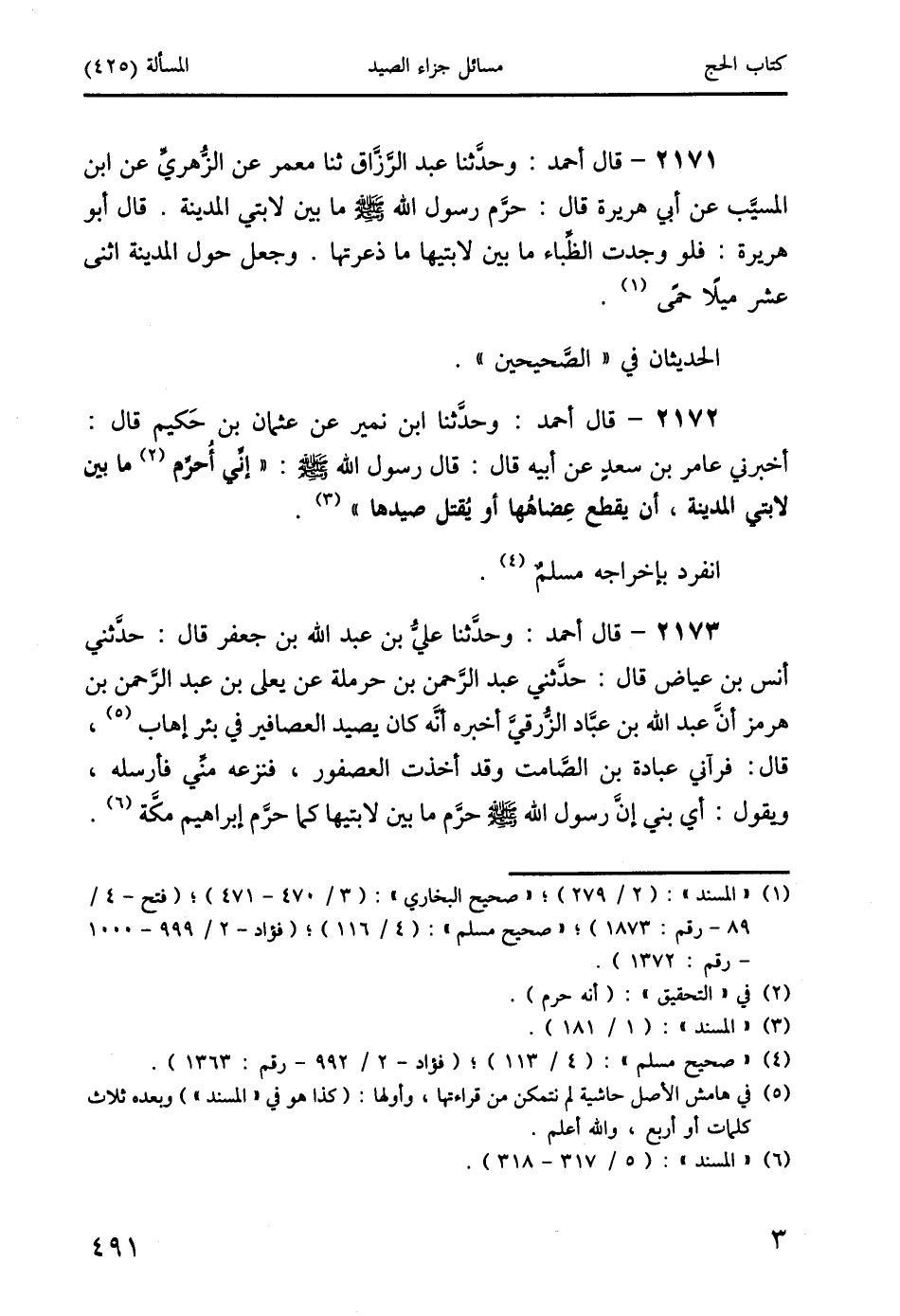 2173 - قال أحمد: وحدَّثنا عليُّ بن عبد الله بن جعفر قال: حدَّثني أنس بن عياض قال: حدَّثني عبد الرَّحمن بن حرملة عن يعلى بن عبد الرَّحمن بن هرمز أنَّ عبد الله بن عبَّاد الزُّرقيَّ أخبره أنَّه كان يصيد العصافير في بئر إهاب (5)، قال: فرآني عبادة بن الصَّامت وقد أخذت العصفور، فنزعه منِّي فأرسله، ويقول: أي بني إنَّ رسول الله صَلَّى اللَّهُ عَلَيْهِ وَسَلَّمَ حرَّم ما بين لابتيها كما حرَّم إبراهيم مكَّة (6).