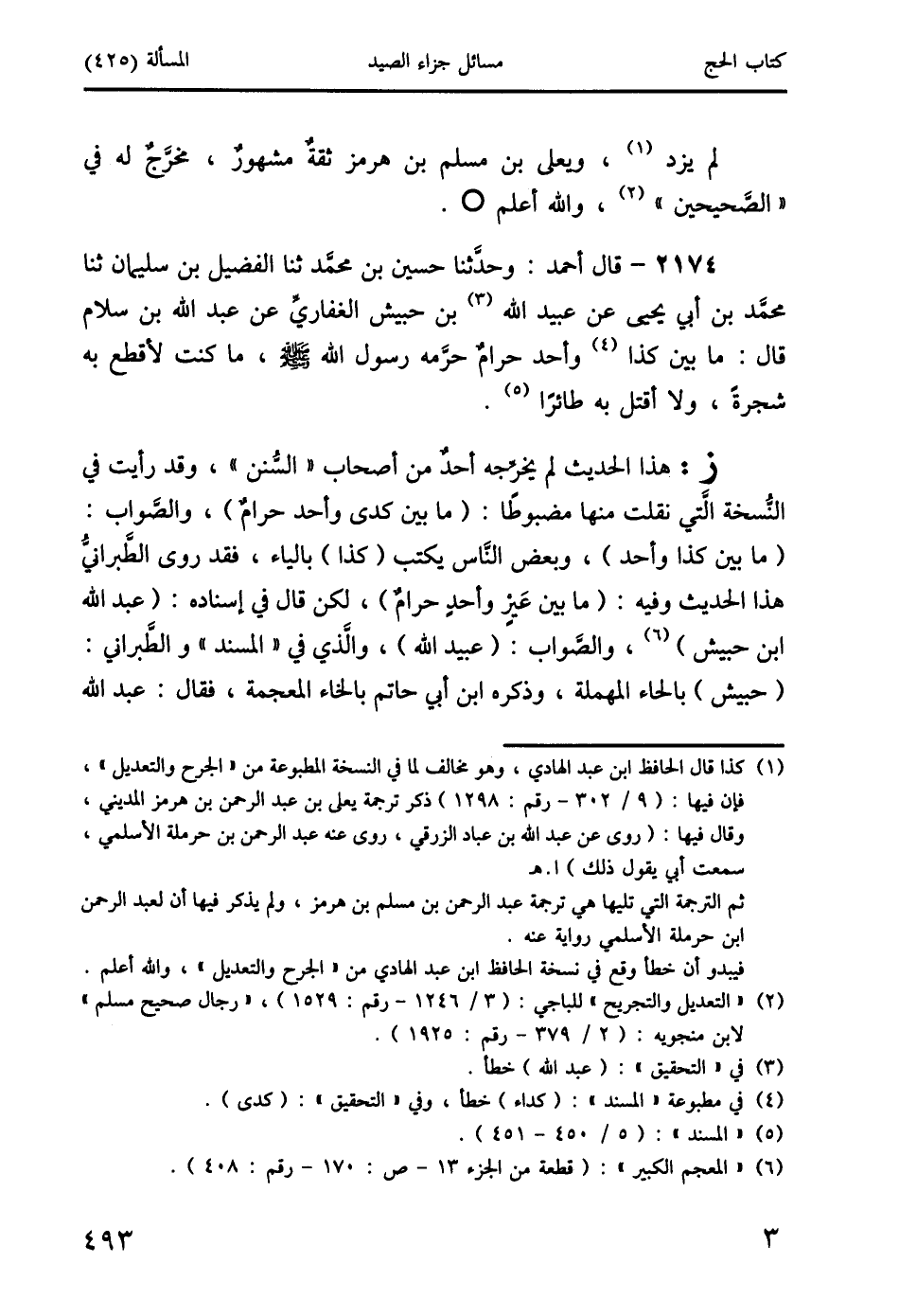2174 - قال أحمد: وحدَّثنا حسين بن محمَّد ثنا الفضيل بن سليمان ثنا محمَّد بن أبي يحيى عن عبيد الله (3) بن حبيش الغفاريِّ عن عبد الله بن سلام قال: ما بين كذا (4) وأحد حرامٌ حرَّمه رسول الله صَلَّى اللَّهُ عَلَيْهِ وَسَلَّمَ، ما كنت لأقطع به شجرةً، ولا أقتل به طائرًا (5).