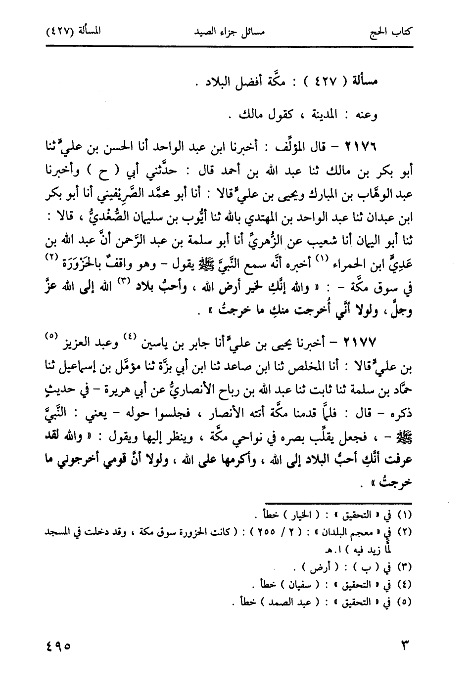 2177 - أخبرنا يحيى بن عليٍّ أنا جابر بن ياسين (4) وعبد العزيز (5) بن عليٍّ قالا: أنا المخلص ثنا ابن صاعد ثنا ابن أبي بزَّة ثنا مؤمَّل بن إسماعيل ثنا حمَّاد بن سلمة ثنا ثابت ثنا عبد الله بن رباح الأنصاريُّ عن أبي هريرة- في حديثٍ ذكره- قال: فلمَّا قدمنا مكَّة أتته الأنصار، فجلسوا حوله- يعني: النَّبيَّ صَلَّى اللَّهُ عَلَيْهِ وَسَلَّمَ -، فجعل يقلِّب بصره في نواحي مكَّة، وينظر إليها ويقول: " والله لقد عرفت أنَّكِ أحبُّ البلاد إلى الله، وأكرمها على الله، ولولا أنَّ قومي أخرجوني ما خرجتُ ".