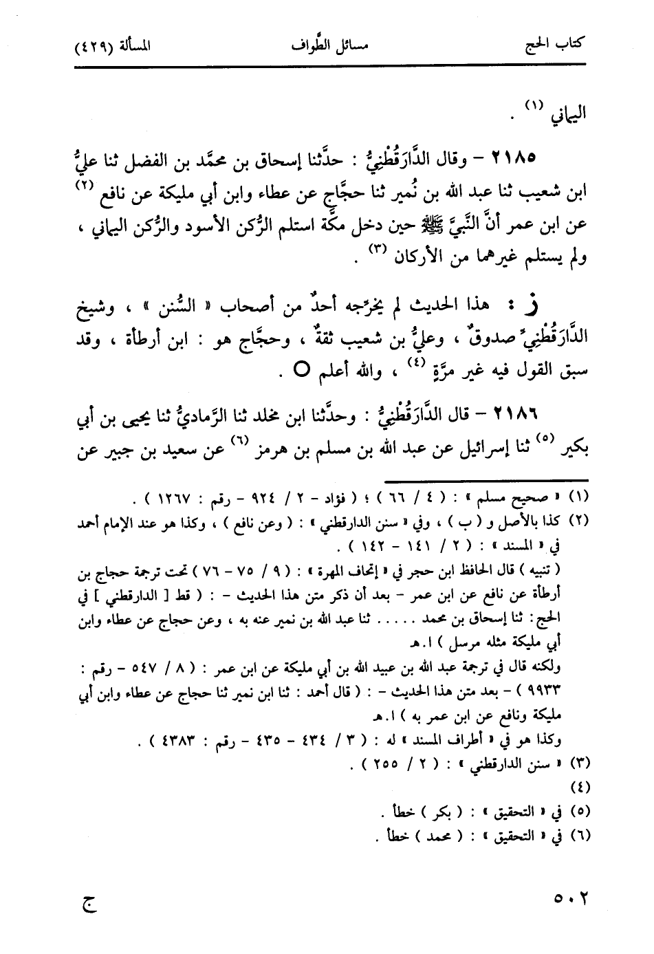 ز: هذا الحديث لم يخرِّجه أحدٌ من أصحاب " السُّنن "، وشيخ الدَّارَقُطْنِيُّ صدوقٌ، وعليُّ بن شعيب ثقةٌ، وحجَّاج هو: ابن أرطأة، وقد سبق القول فيه غير مرَّةٍ (4)، والله أعلم O.