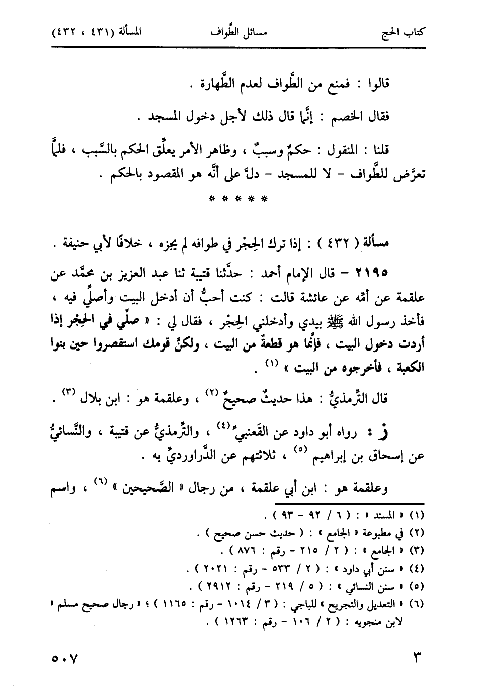 2195 - قال الإمام أحمد: حدَّثنا قتيبة ثنا عبد العزيز بن محمَّد عن علقمة عن أمِّه عن عائشة قالت: كنت أحبُّ أن أدخل البيت وأصلِّي فيه، فأخذ رسول الله صَلَّى اللَّهُ عَلَيْهِ وَسَلَّمَ بيدي وأدخلني الحجر، فقال لي: " صلِّي في الحجر إذا أردت دخول البيت، فإنَّما هو قطعةٌ من البيت، ولكنَّ قومك استقصروا حين بنوا الكعبة، فأخرجوه من البيت " (1).