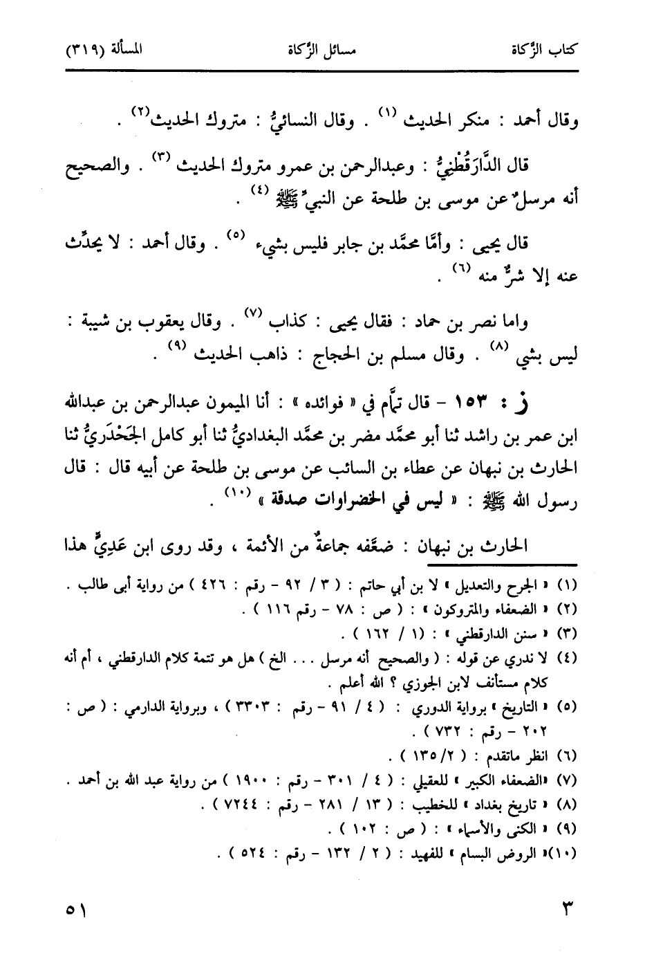 ز: 153 - قال تمَّام في "فوائده": أنا الميمون عبد الرحمن بن عبد الله ابن عمر بن راشد ثنا أبو محمَّد مضر بن محمَّد البغداديُّ ثنا أبو كامل الجَحْدَريُّ ثنا الحارث بن نبهان عن عطاء بن السائب عن موسى بن طلحة عن أبيه قال: قال رسول الله صَلَّى اللَّهُ عَلَيْهِ وَسَلَّمَ: " ليس في الخضراوات صدقة " (10).