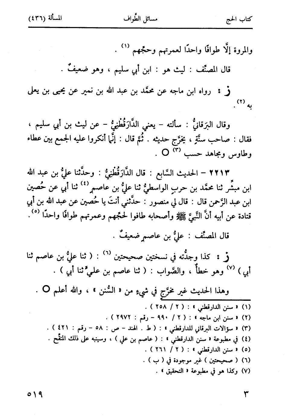 2213 - الحديث السَّابع: قال الدَّارَقُطْنِيُّ: وحدَّثنا عليُّ بن عبد الله ابن مبشِّر ثنا محمَّد بن حربٍ الواسطيُّ ثنا عليُّ بن عاصمٍ (4) ثنا أبي عن حُصين ابن عبد الرَّحمن قال: قال لي منصور: حدَّثني أنتَ يا حُصين عن عبد الله بن أبي