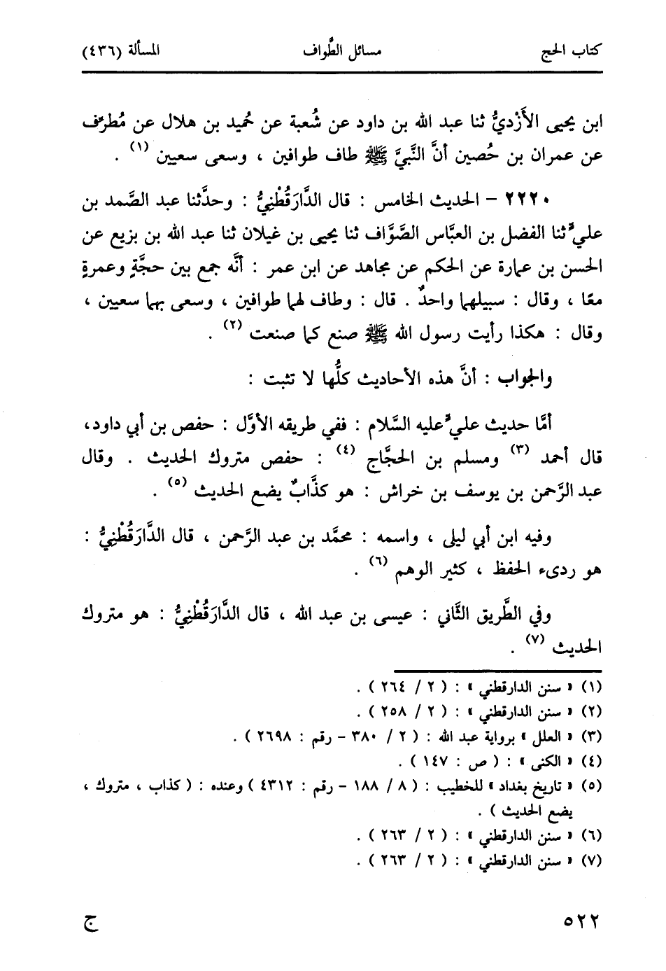 ابن يحيى الأَزْديُّ ثنا عبد الله بن داود عن شُعبة عن حمُيد بن هلال عن مُطرِّف عن عمران بن حُصين أنَّ النَّبيَّ-صَلَّى اللَّهُ عَلَيْهِ وَسَلَّمَ طاف طوافين، وسعى سعيين (1).
