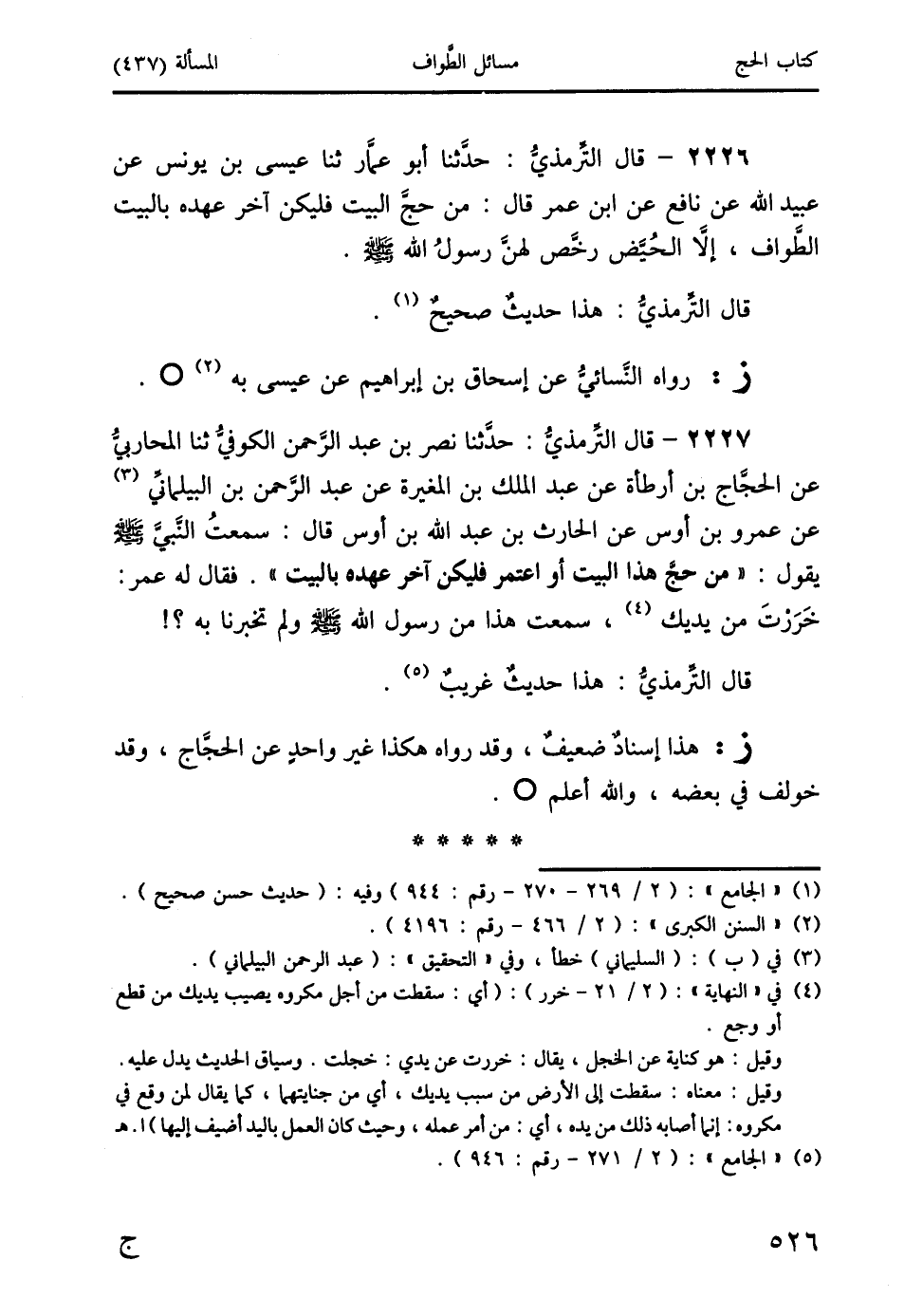 2227 - قال التِّرمذيُّ: حدَّثنا نصر بن عبد الرَّحمن الكوفيُّ ثنا المحاربيُّ عن الحجَّاج بن أرطأة عن عبد الملك بن المغيرة عن عبد الرَّحمن بن البيلمانيِّ (3) عن عمرو بن أوس عن الحارث بن عبد الله بن أوس قال: سمعتُ النَّبيَّ صَلَّى اللَّهُ عَلَيْهِ وَسَلَّمَ يقول: " من حجَّ هذا البيت أو اعتمر فليكن آخر عهده بالبيت ". فقال له عمر: خَرَرْتَ من يديك (4)، سمعت هذا من رسول الله صَلَّى اللَّهُ عَلَيْهِ وَسَلَّمَ ولم تخبرنا به؟! قال التِّرمذيُّ: هذا حديثٌ غريبٌ (5).