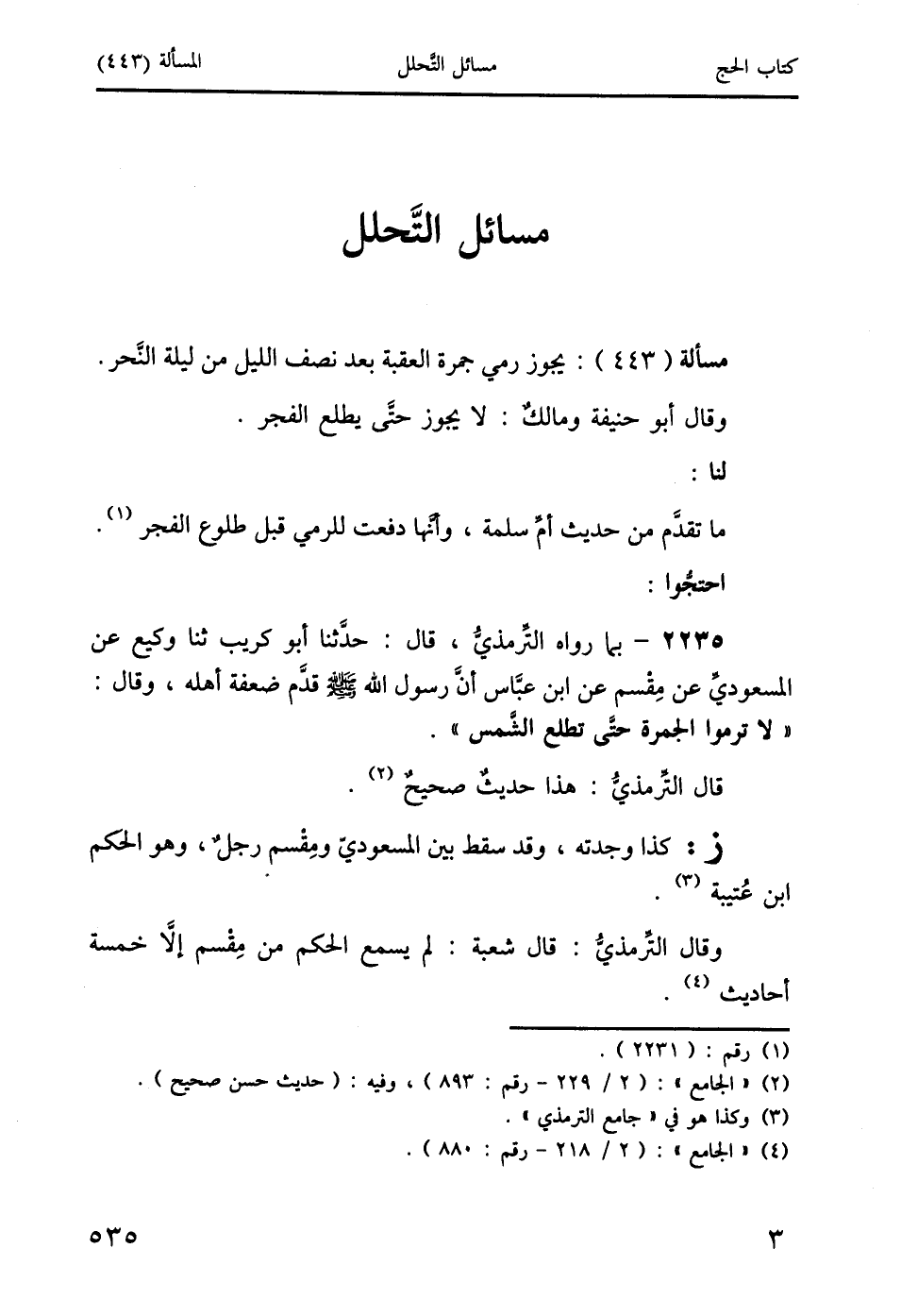 2235 - بما رواه التِّرمذيُّ، قال: حدَّثنا أبو كريب ثنا وكيع عن المسعوديِّ عن مِقْسم عن ابن عبَّاس أنَّ رسول الله صَلَّى اللَّهُ عَلَيْهِ وَسَلَّمَ قدَّم ضعفة أهله، وقال: " لا ترموا الجمرة حتَّى تطلع الشَّمس ".