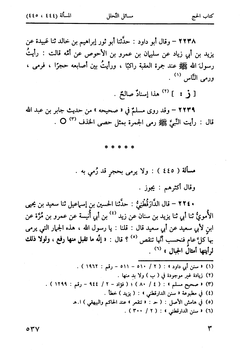2239 - وقد روى مسلمٌ في "صحيحه" من حديث جابر بن عبد الله قال: رأيت النَّبيَّ صَلَّى اللَّهُ عَلَيْهِ وَسَلَّمَ رمى الجمرة بمثل حصى الخذف (3) O.