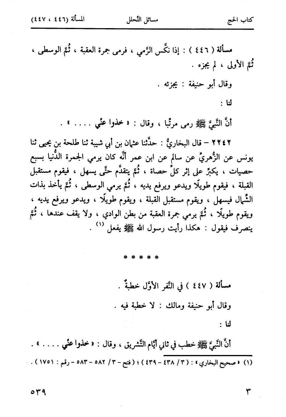 أنَّ النَّبيَّ-صَلَّى اللَّهُ عَلَيْهِ وَسَلَّمَ رمى مرتِّبا، وقال: " خذوا عنِّي .... ".