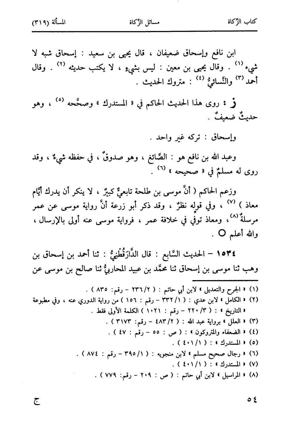 وزعم الحاكم (أنَّ موسى بن طلحة تابعيٌّ كبيرٌ، لا ينكر أن يدرك أيَّام معاذ) (7)، وفي قوله نظرٌ، وقد ذكر أبو زرعة أنَّ رواية موسى عن عمر مرسلةٌ (8)، ومعاذ توفِّي في خلافة عمر، فرواية موسى عنه أولى بالإرسال، والله أعلم O.