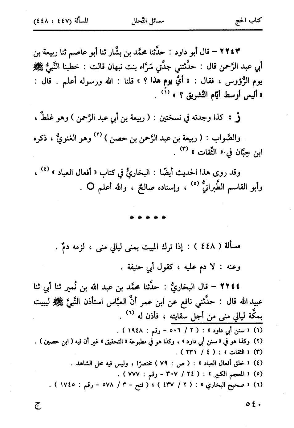 2243 - قال أبو داود: حدَّثنا محمَّد بن بشَّار ثنا أبو عاصم ثنا ربيعة بن أبي عبد الرَّحمن قال: حدَّثتني جدَّتي سَرَّاء بنت نبهان قالت: خطبنا النَّبيُّ صَلَّى اللَّهُ عَلَيْهِ وَسَلَّمَ يوم الرُّؤوس، فقال: " أيُّ يوم هذا؟ " قلنا: الله ورسوله أعلم. قال: