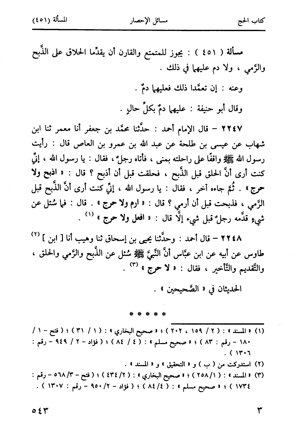 2248 - قال أحمد: وحدَّثنا يحيى بن إسحاق ثنا وهيب أنا [ابن] (2) طاوس عن أبيه عن ابن عبَّاس أنَّ النَّبيَّ صَلَّى اللَّهُ عَلَيْهِ وَسَلَّمَ سُئل عن الذَّبح والرَّمي والحلق، والتَّقديم والتَّأخير، فقال: " لا حرج " (3).