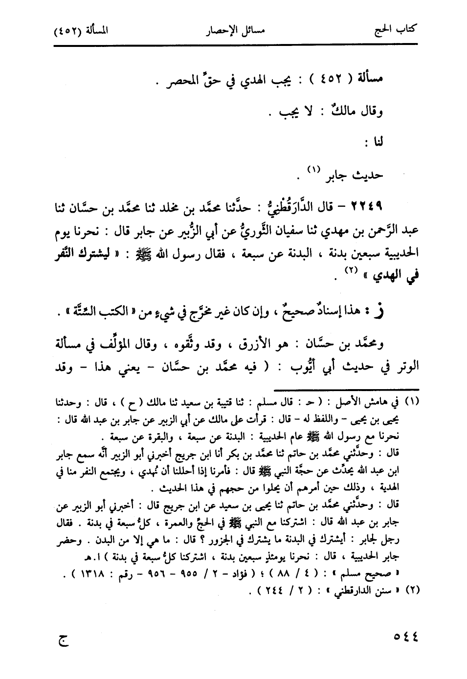 2249 - قال الدَّارَقُطْنِيُّ: حدَّثنا محمَّد بن مخلد ثنا محمَّد بن حسَّان ثنا عبد الرَّحمن بن مهدي ثنا سفيان الثَّوريُّ عن أبي الزُّبير عن جابر قال: نحرنا يوم الحديبية سبعين بدنة، البدنة عن سبعة، فقال رسول الله صَلَّى اللَّهُ عَلَيْهِ وَسَلَّمَ: " ليشترك النَّفر في الهدي " (2).