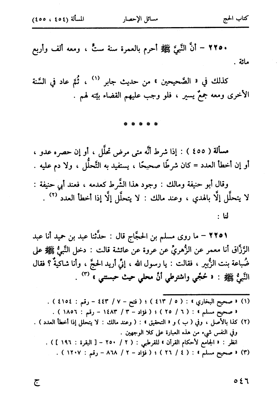 2251 - ما روى مسلم بن الحجَّاج قال: حدَّثنا عبد بن حميد أنا عبد الرَّزَّاق أنا معمر عن الزُّهريِّ عن عروة عن عائشة قالت: دخل النَّبيُّ صَلَّى اللَّهُ عَلَيْهِ وَسَلَّمَ على ضُباعة بنت الزُّبير، فقالت: يا رسول الله، إنِّي أريد الحجَّ، وأنا شاكيةٌ؟ فقال النَّبيُّ صَلَّى اللَّهُ عَلَيْهِ وَسَلَّمَ: " حُجِّي واشترطي أنَّ محلي حيث حبستني " (3).