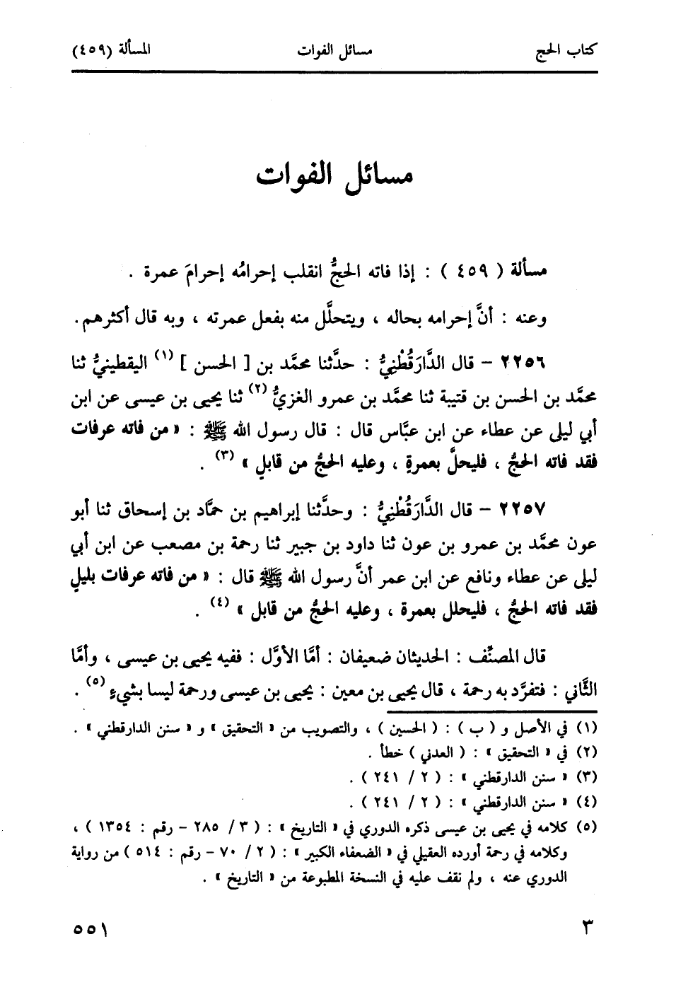 2257 - قال الدَّارَقُطْنِيُّ: وحدَّثنا إبراهيم بن حمَّاد بن إسحاق ثنا أبو عون محمَّد بن عمرو بن عون ثنا داود بن جبير ثنا رحمة بن مصعب عن ابن أبي ليلى عن عطاء ونافع عن ابن عمر أنَّ رسول الله صَلَّى اللَّهُ عَلَيْهِ وَسَلَّمَ قال: " من فات عرفات بليلٍ فقد فاته الحجُّ، فليحلل بعمرة، وعليه الحجُّ من قابل " (4).