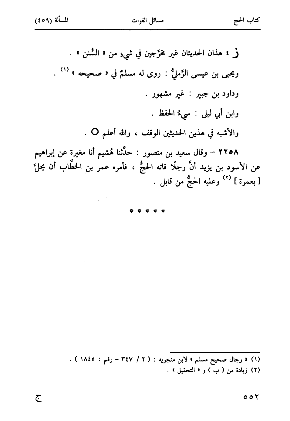 2258 - وقال سعيد بن منصور: حدَّثنا هُشيم أنا مغيرة عن ابراهيم عن الأسود بن يزيد أنَّ رجلاً فاته الحجُّ، فأمره عمر بن الخطَّاب أن يحلَّ [بعمرة] (2) وعليه الحجُّ من قابل.