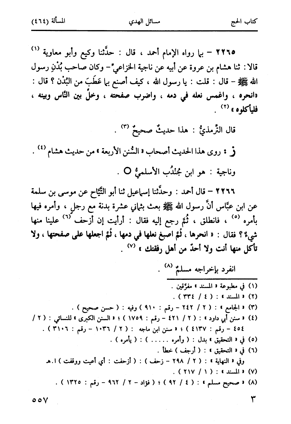 2265 - بما رواه الإمام أحمد، قال: حدَّثنا وكيع وأبو معاوية (1) قالا: ثنا هشام بن عروة عن أبيه عن ناجية الخزاعيِّ- وكان صاحب بُدْنِ رسول الله صَلَّى اللَّهُ عَلَيْهِ وَسَلَّمَ- قال: قلت: يا رسول الله، كيف أصنع بما عَطَبَ من البُدْن؟ قال: "انحره، واغمس نعله في دمه، واضرب صفحته، وخلِّ بين النَّاس وبينه، فليأكلوه " (2).