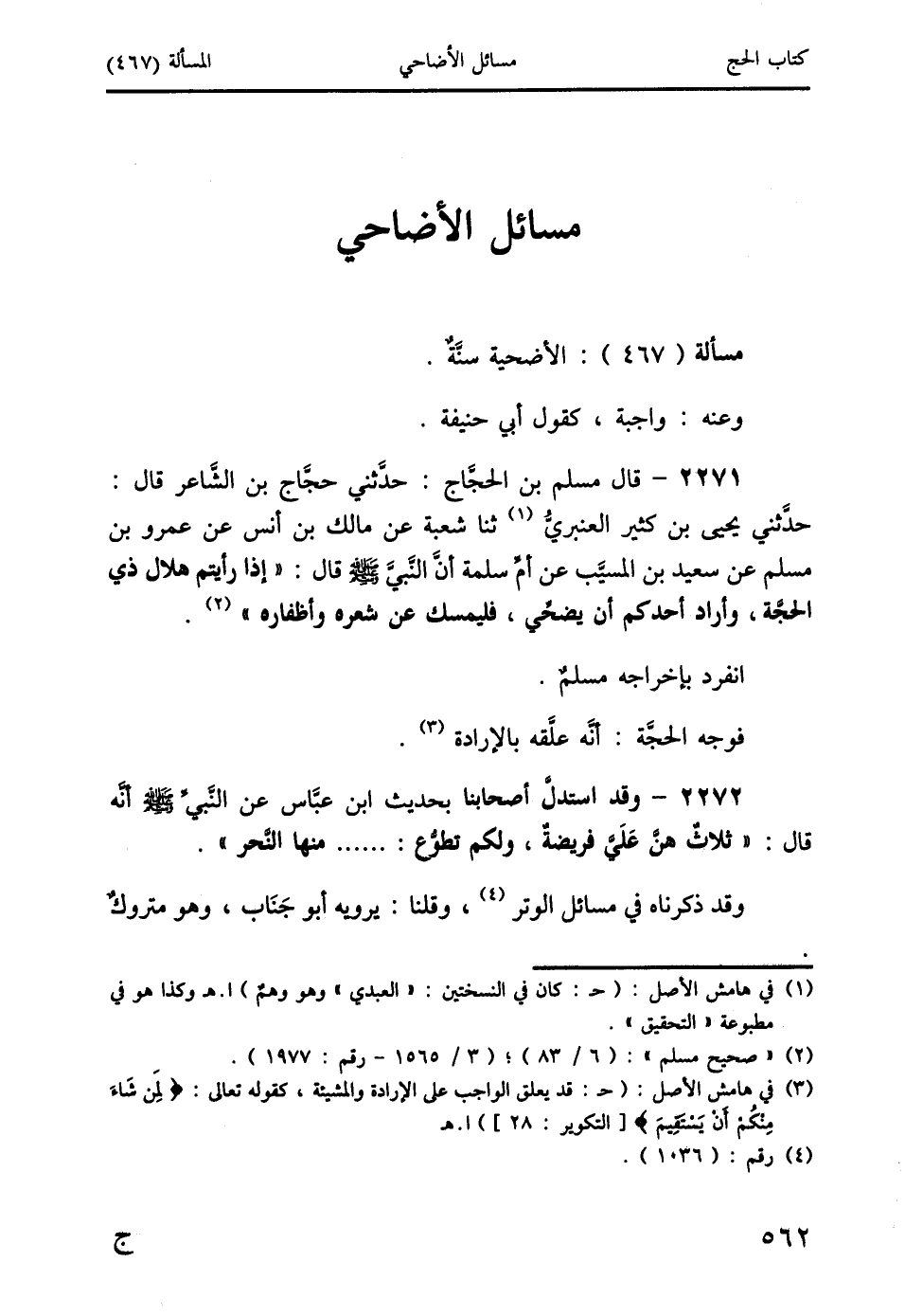 2271 - قال مسلم بن الحجَّاج: حدَّثني حجَّاج بن الشَّاعر قال: حدَّثني يحيى بن كثير العنبريُّ (1) ثنا شعبة عن مالك بن أنس عن عمرو بن مسلم عن سعيد بن المسيَّب عن أمِّ سلمة أنَّ النَّبيَّ صَلَّى اللَّهُ عَلَيْهِ وَسَلَّمَ قال: " إذا رأيتم هلال ذي الحجَّة، وأراد أحدكم أن يضحِّي، فليمسك عن شعره وأظفاره " (2).