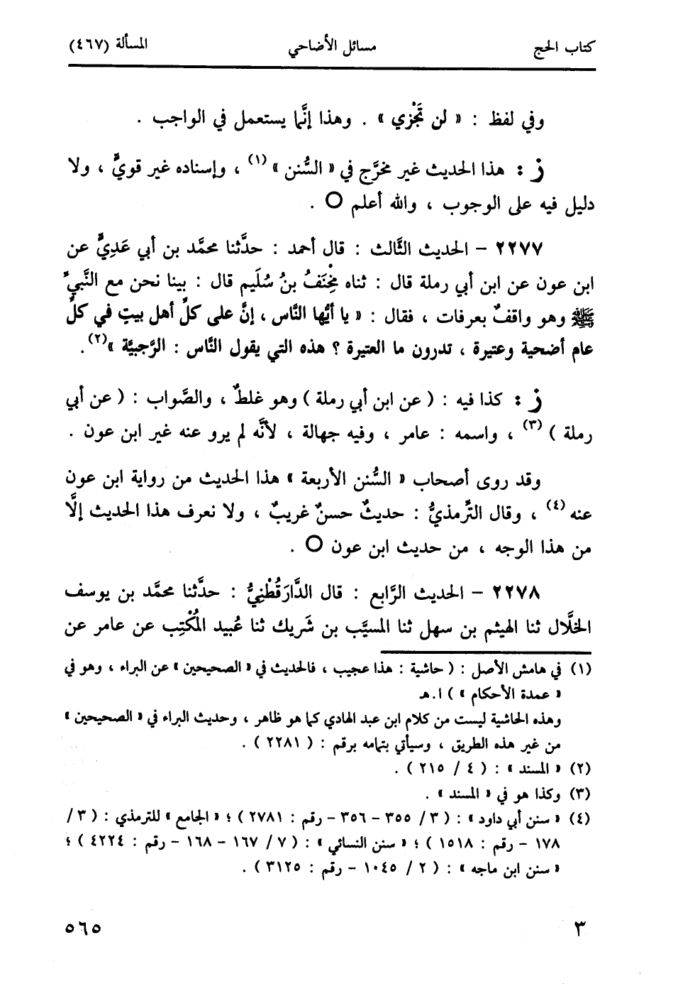 2277 - الحديث الثَّالث: قال أحمد: حدَّثنا محمَّد بن أبي عَدِيٍّ عن ابن عون عن ابن أبي رملة قال: ثناه مِخْنَفُ بنُ سُلَيم قال: بينا نحن مع النَّبيِّ صَلَّى اللَّهُ عَلَيْهِ وَسَلَّمَ وهو واقفٌ بعرفات، فقال: " يا أيُّها النَّاس، إنَّ على كلِّ أهل بيتٍ فى كلِّ عام أضحية وعتيرة، تدرون ما العتيرة؟ هذه التي يقول النَّاس: الرَّجبيَّة " (2).