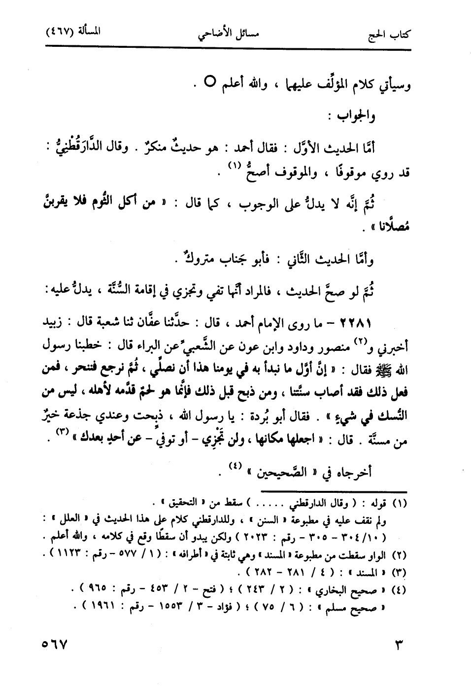 الله صَلَّى اللَّهُ عَلَيْهِ وَسَلَّمَ فقال: " إنَّ أوَّل ما نبدأ به في يومنا هذا أن نصلِّي، ثُمَّ نرجع فننحر، فمن فعل ذلك فقد أصاب سنَّتنا، ومن ذبح قبل ذلك فإنَّما هو لحمٌ قدَّمه لأهله، ليس من النُّسك في شيءٍ ". فقال أبو بُردة: يا رسول الله، ذبحت وعندي جذعة خيرٌ من مسنَّة. قال: " اجعلها مكانها، ولن تَجْزِي- أو توفِّي- عن أحدٍ بعدك " (3).