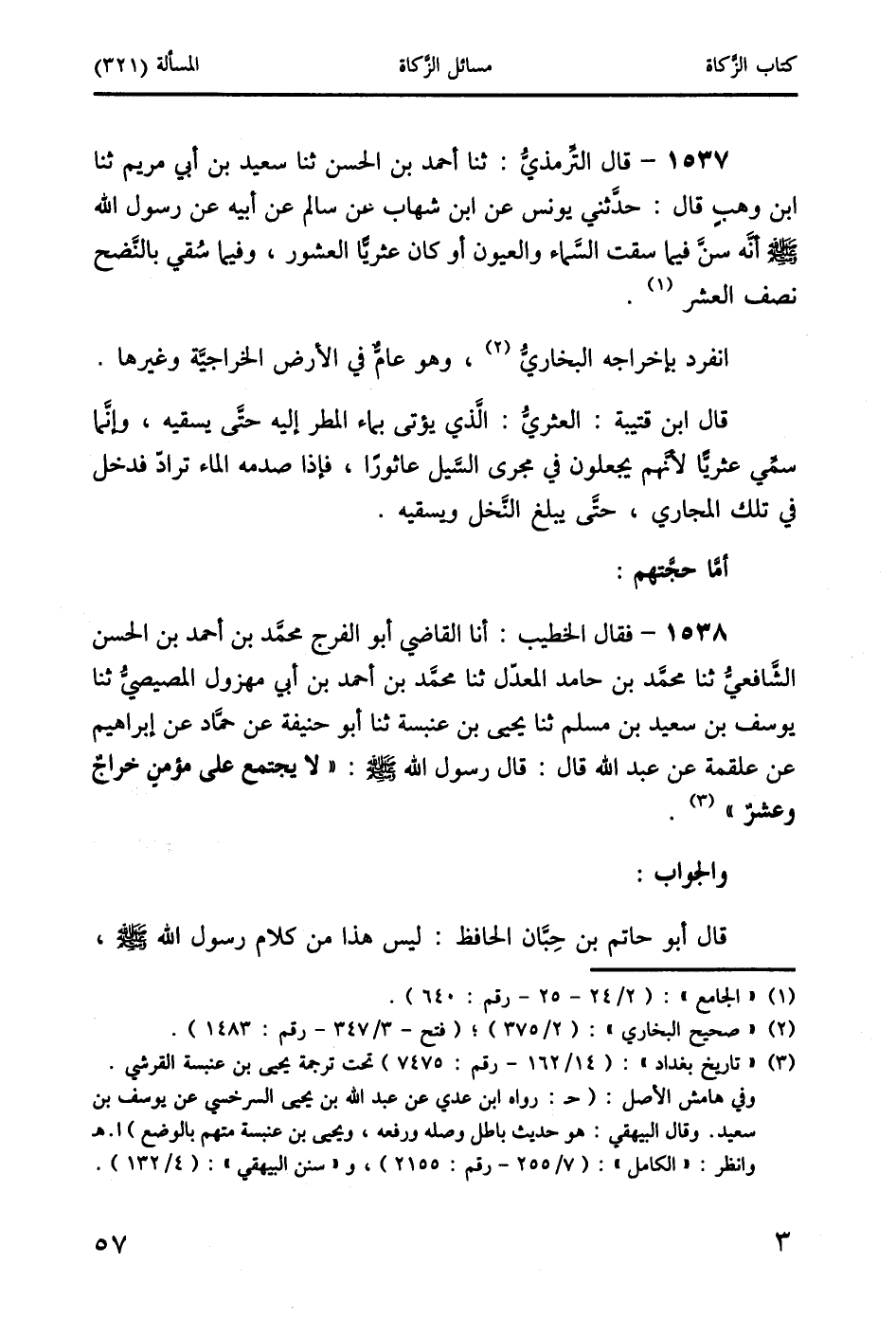 1537 - قال التِّرمذيُّ: ثنا أحمد بن الحسن ثنا سعيد بن أبي مريم ثنا ابن وهبٍ قال: حدَّثني يونس عن ابن شهاب عن سالم عن أبيه عن رسول الله صَلَّى اللَّهُ عَلَيْهِ وَسَلَّمَ أنَّه سنَّ فيما سقت السَّماء والعيون أو كان عثريًّا العشور، وفيما سُقي بالنَّضح نصف العشر (1).