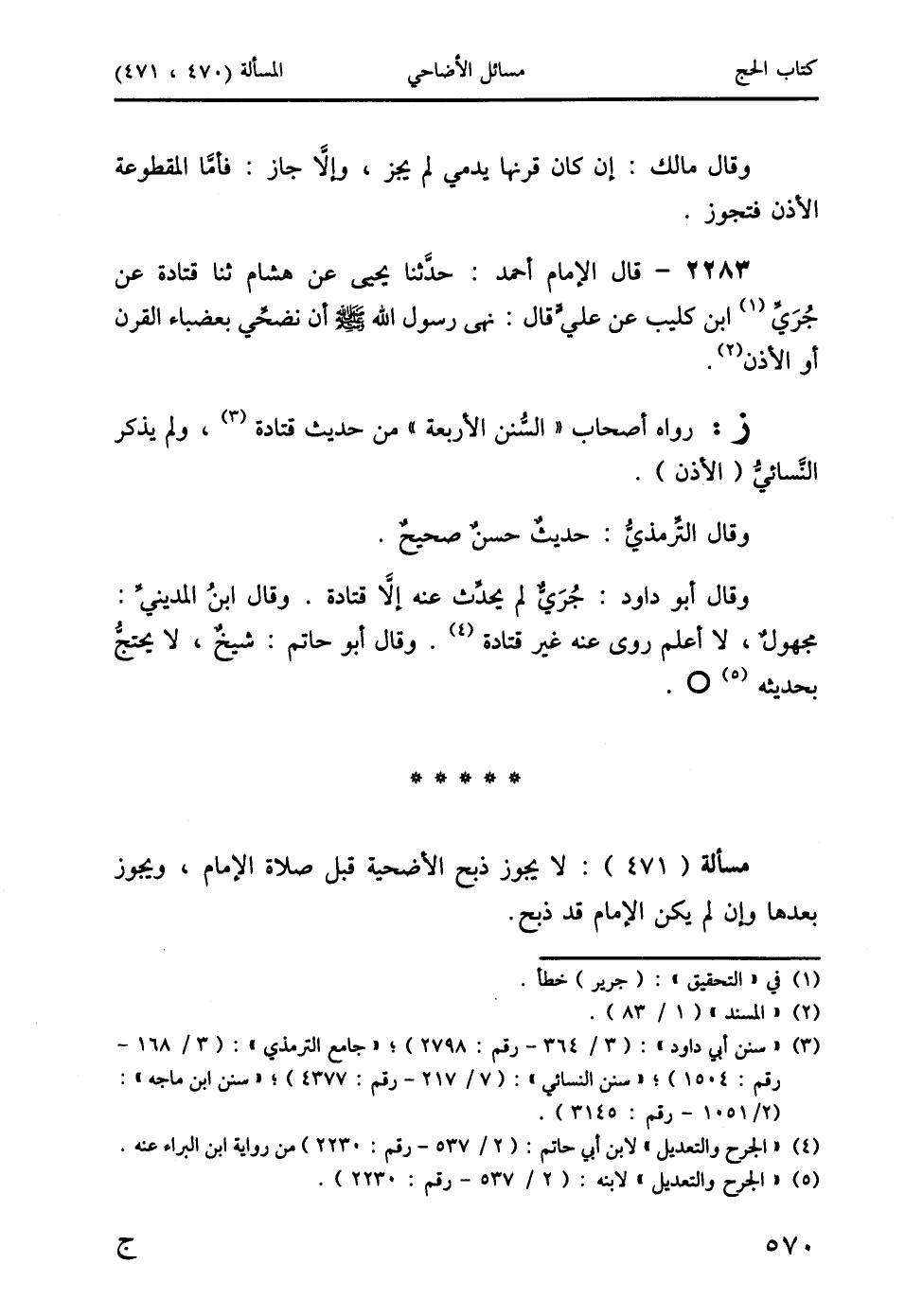 2283 - قال الإمام أحمد: حدَّثنا يحيى عن هشام ثنا قتادة عن جُرَيِّ (1) ابن كليب عن عليٍّ قال: نهى رسول الله صَلَّى اللَّهُ عَلَيْهِ وَسَلَّمَ أن نضحِّي بعضباء القرن أو الأذن (2).