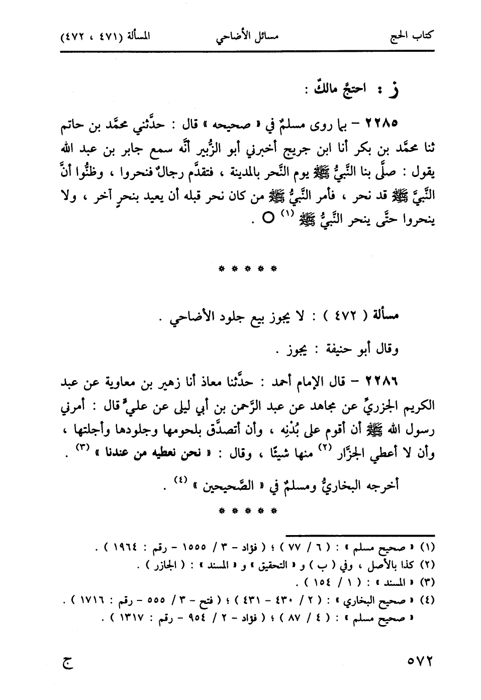 2285 - بما روى مسلمٌ في "صحيحه" قال: حدَّثني محمَّد بن حاتم ثنا محمَّد بن بكر أنا ابن جريج أخبرني أبو الزُّبير أنَّه سمع جابر بن عبد الله يقول: صلَّى بنا النَّبيُّ صَلَّى اللَّهُ عَلَيْهِ وَسَلَّمَ يوم النَّحر بالمدينة، فتقدَّم رجالٌ فنحروا، وظنُّوا أنَّ النَّبيَّ صَلَّى اللَّهُ عَلَيْهِ وَسَلَّمَ قد نحر، فأمر النَّبيُّ صَلَّى اللَّهُ عَلَيْهِ وَسَلَّمَ من كان نحر قبله أن يعيد بنحرٍ آخر، ولا ينحروا حتَّى ينحر النَّبيُّ-صَلَّى اللَّهُ عَلَيْهِ وَسَلَّمَ (1) O.