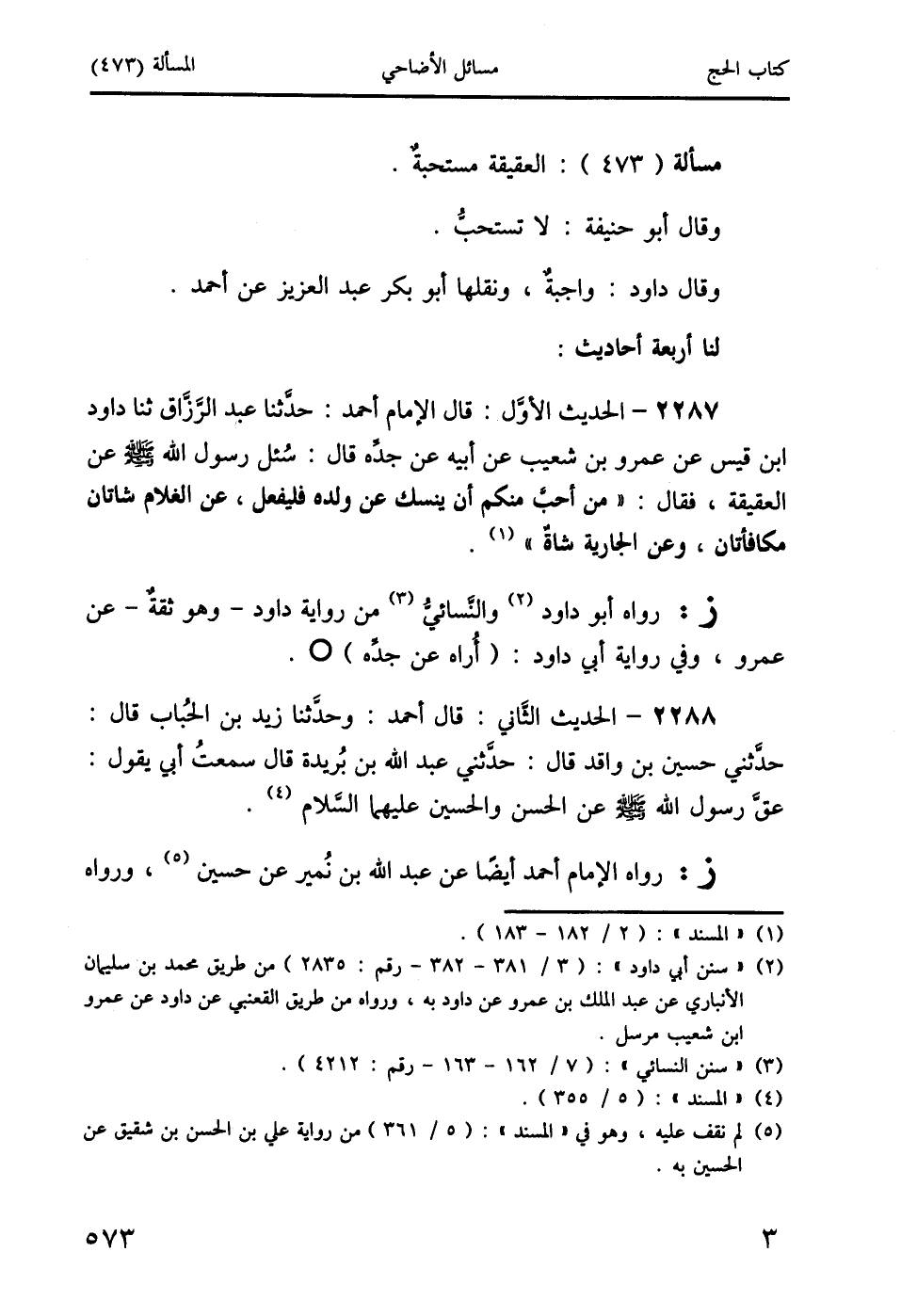 2288 - الحديث الثَّاني: قال أحمد: وحدَّثنا زيد بن الحُباب قال: حدَّثني حسين بن واقد قال: حدَّثني عبد الله بن بُريدة قال سمعتُ أبي يقول: عقَّ رسول الله-صَلَّى اللَّهُ عَلَيْهِ وَسَلَّمَ عن الحسن والحسين عليهما السَّلام (4).