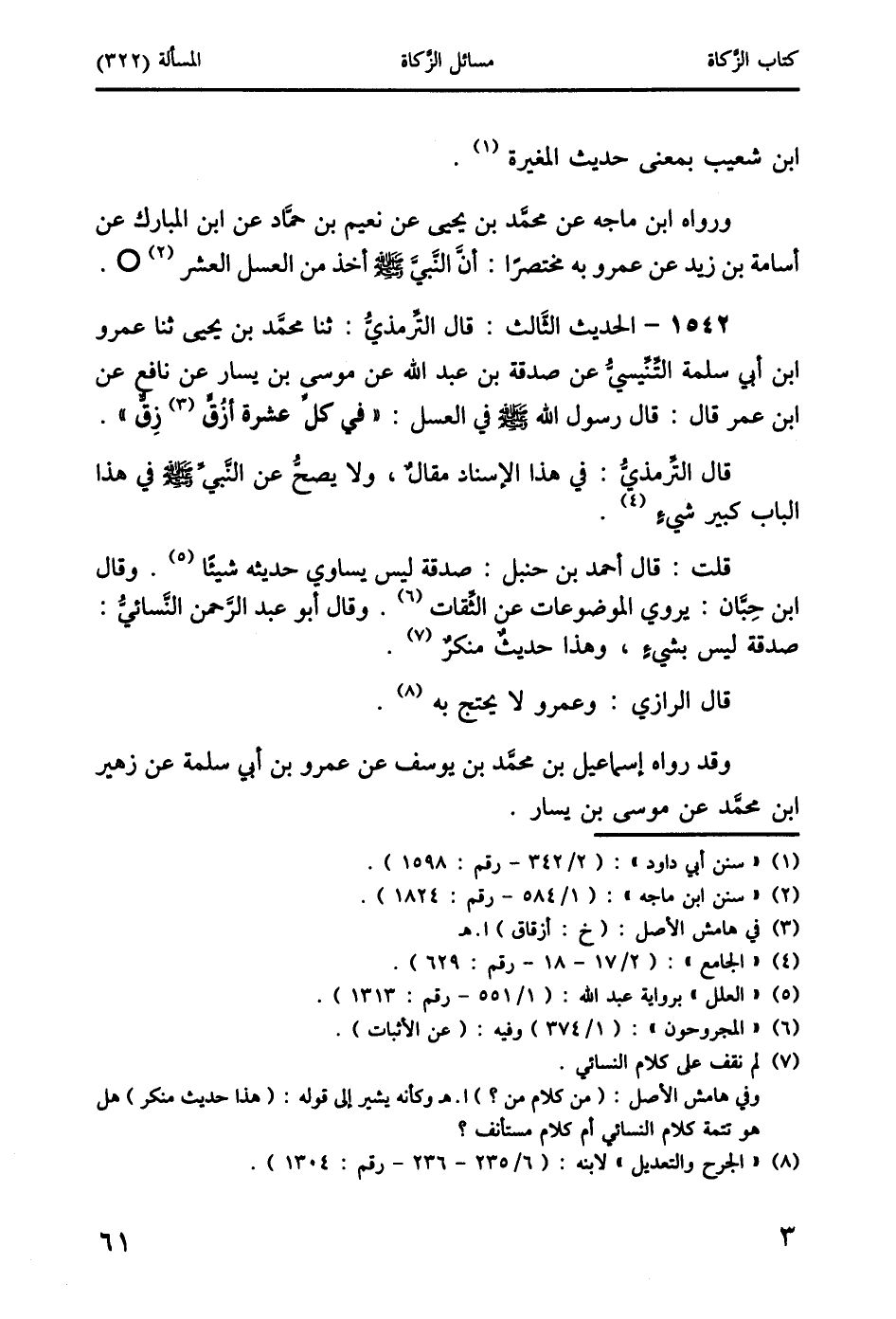 ورواه ابن ماجة عن محمَّد بن يحيى عن نعيم بن حمَّاد عن ابن المبارك عن أسامة بن زيد عن عمرو به مختصرًا: أنَّ النَّبيَّ-صَلَّى اللَّهُ عَلَيْهِ وَسَلَّمَ أخذ من العسل العشر (2) O.