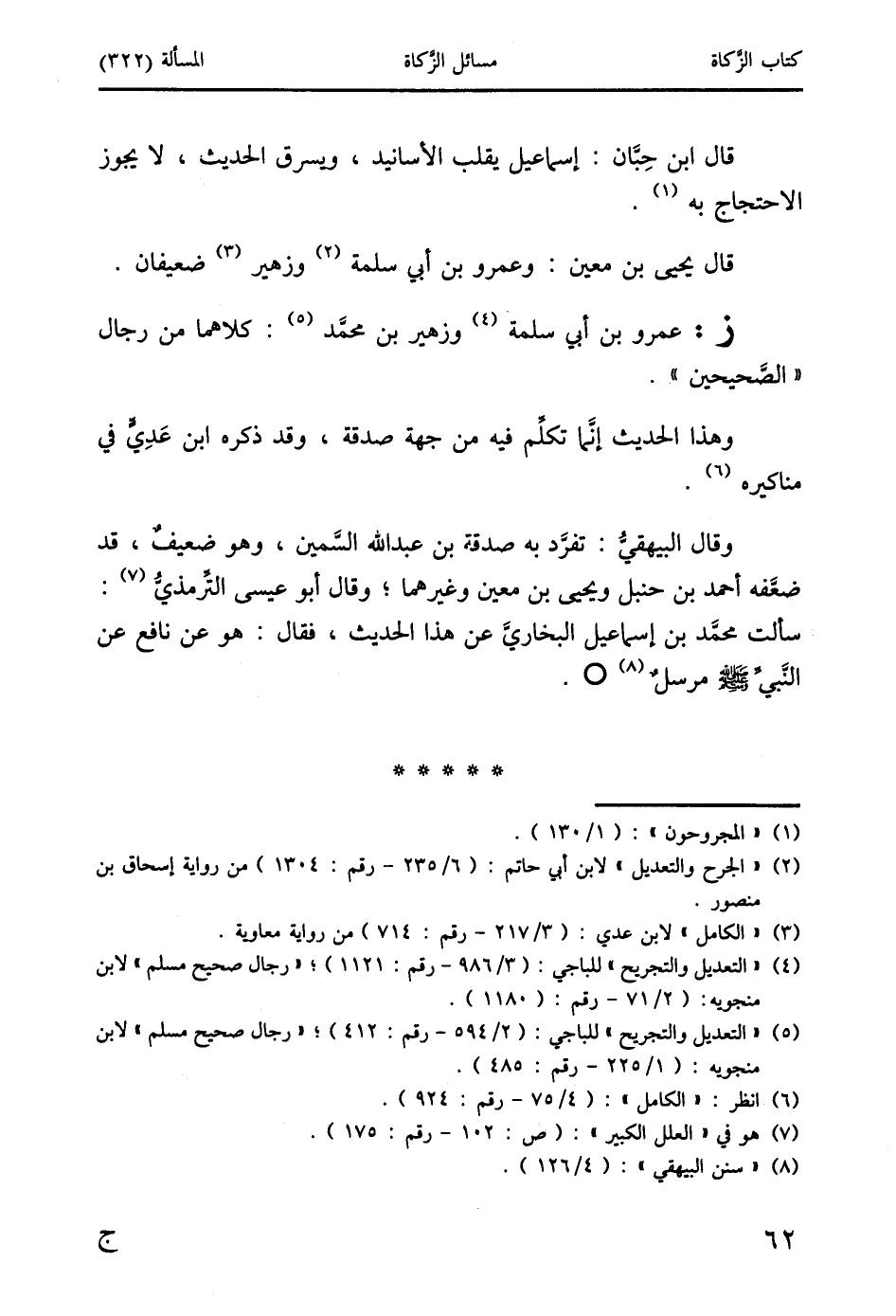 وقال البيهقيُّ: تفرَّد به صدقة بن عبد الله السَّمين، وهو ضعيفٌ، قد ضعَّفه أحمد بن حنبل ويحيى بن معين وغيرهما؛ وقال أبو عيسى التِّرمذيُّ (7): سألت محمَّد بن إسماعيل البخاريَّ عن هذا الحديث، فقال: هو عن نافع عن النَّبيِّ صَلَّى اللَّهُ عَلَيْهِ وَسَلَّمَ مرسلٌ (8) O.