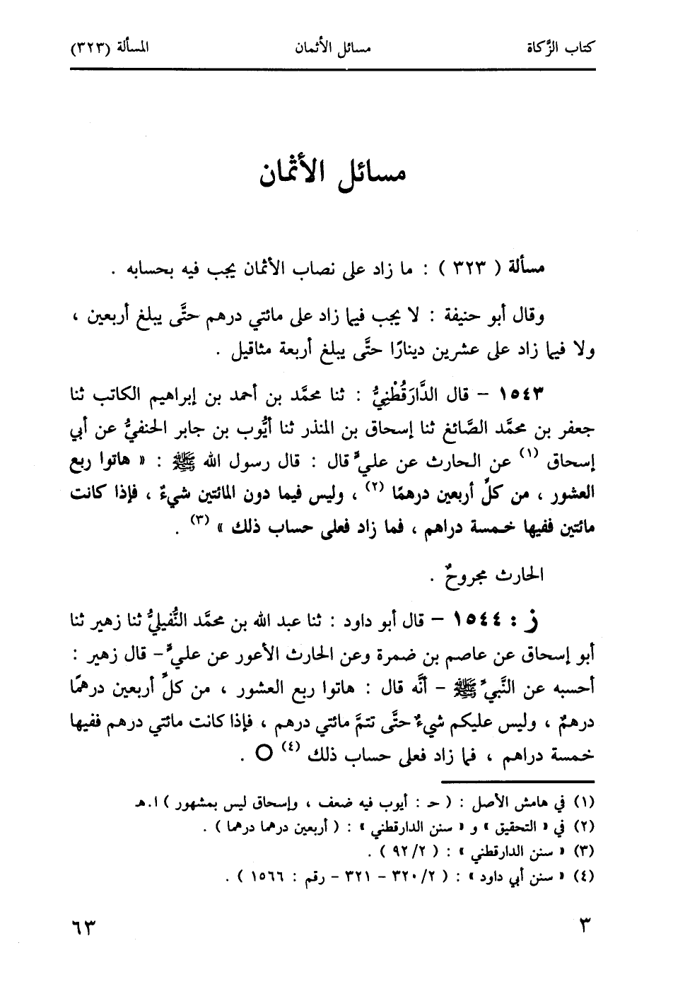 ز: 1544 - قال أبو داود: ثنا عبد الله بن محمَّد النُّفيليُّ ثنا زهير ثنا أبو إسحاق عن عاصم بن ضمرة وعن الحارث الأعور عن عليٍّ- قال زهير: أحسبه عن النَّبيِّ صَلَّى اللَّهُ عَلَيْهِ وَسَلَّمَ- أنَّه قال: هاتوا ربع العشور، من كلِّ أربعين درهمًا درهمٌ، وليس عليكم شيءٌ حتَّى تتمَّ مائتي درهم، فإذا كانت مائتي درهم ففيها خمسة دراهم، فما زاد فعلى حساب ذلك (4) O.