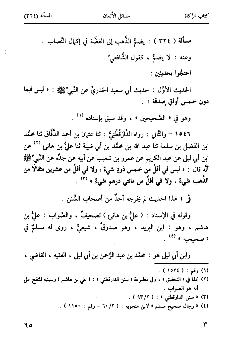 1546 - والثَّاني: رواه الدَّارَقُطْنِيُّ: ثنا عثمان بن أحمد الدَّقاق ثنا محمَّد ابن الفضل بن سلمة ثنا عبد الله بن محمَّد بن أبي شيبة ثنا عليُّ بن هانئ (2) عن ابن أبي ليلى عن عبد الكريم عن عمرو بن شعيب عن أبيه عن جدِّه عن النَّبيِّ صَلَّى اللَّهُ عَلَيْهِ وَسَلَّمَ أنَّه قال: " ليس في أقلِّ من خمس ذودٍ شيءٌ، ولا في أقلِّ من عشرين مثقالاً من الذَّهب شيءٌ، ولا في أقل من مائتي درهم شيءٌ " (3).