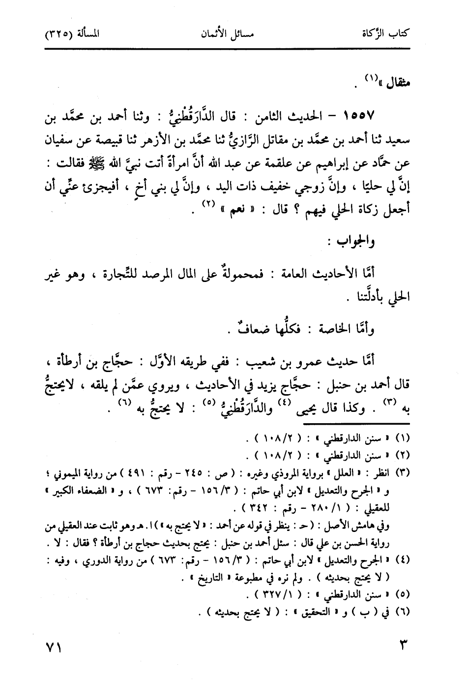 1557 - الحديث الثامن: قال الدَّارَقُطْنِيُّ: وثنا أحمد بن محمَّد بن سعيد ثنا أحمد بن محمَّد بن مقاتل الرَّازيُّ ثنا محمَّد بن الأزهر ثنا قبيصة عن سفيان عن حمَّاد عن إبراهيم عن علقمة عن عبد الله أنَّ امرأةً أتت نبيَّ الله صَلَّى اللَّهُ عَلَيْهِ وَسَلَّمَ فقالت: إنَّ لي حليًّا، وإنَّ زوجي خفيف ذات اليد، وإنَّ لي بني أخٍ، أفيجزئ عنِّي أن أجعل زكاة الحلي فيهم؟ قال: " نعم " (2).