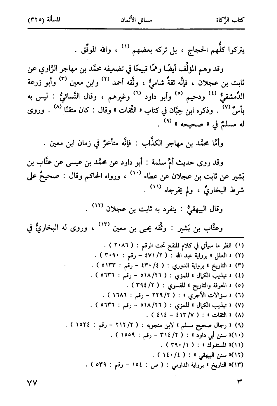 وقد وهم المؤلِّف أيضًا وهمًا قبيحًا في تضعيفه محمَّد بن مهاجر الرَّاوي عن ثابت بن عجلان، فإنَّه ثقةٌ شاميٌّ، وثَّقه أحمد (2) وابن معين (3) وأبو زرعة الدِّمشقيُّ (4) ودحيم (5) وأبو داود (6) وغيرهم، وقال النَّسائيُّ: ليس به بأسٌ (7). وذكره ابن حِبَّان في كتاب "الثِّقات" وقال: كان متقنًا (8). وروى له مسلمٌ في "صحيحه" (9).