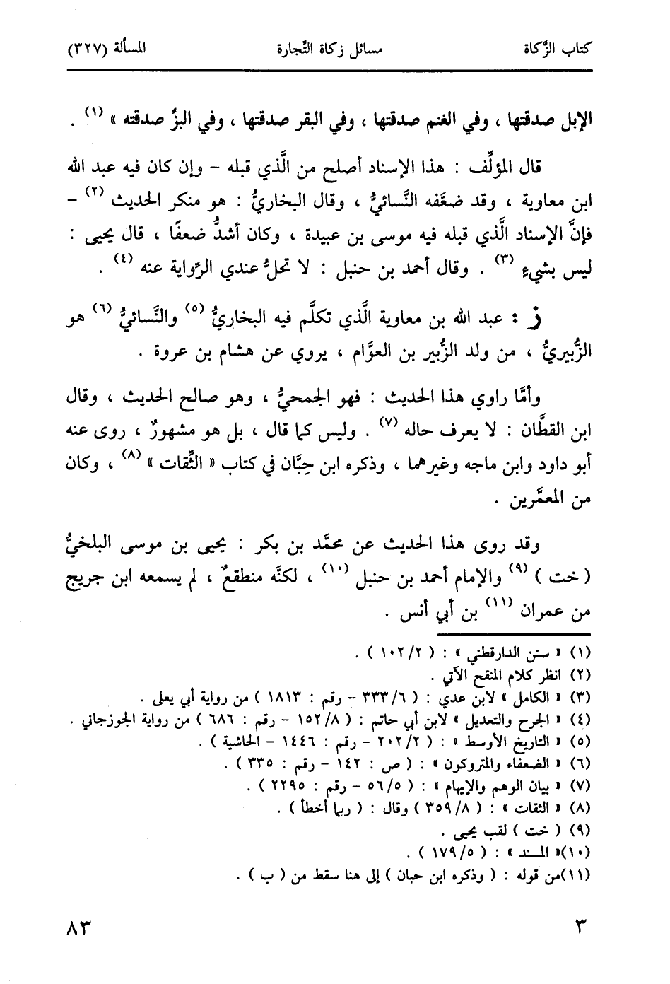 ز: عبد الله بن معاوية الَّذي تكلَّم فيه البخاريُّ (5) والنَّسائيُّ (6) هو الزُّبيريُّ، من ولد الزُّبير بن العوَّام، يروي عن هشام بن عروة.