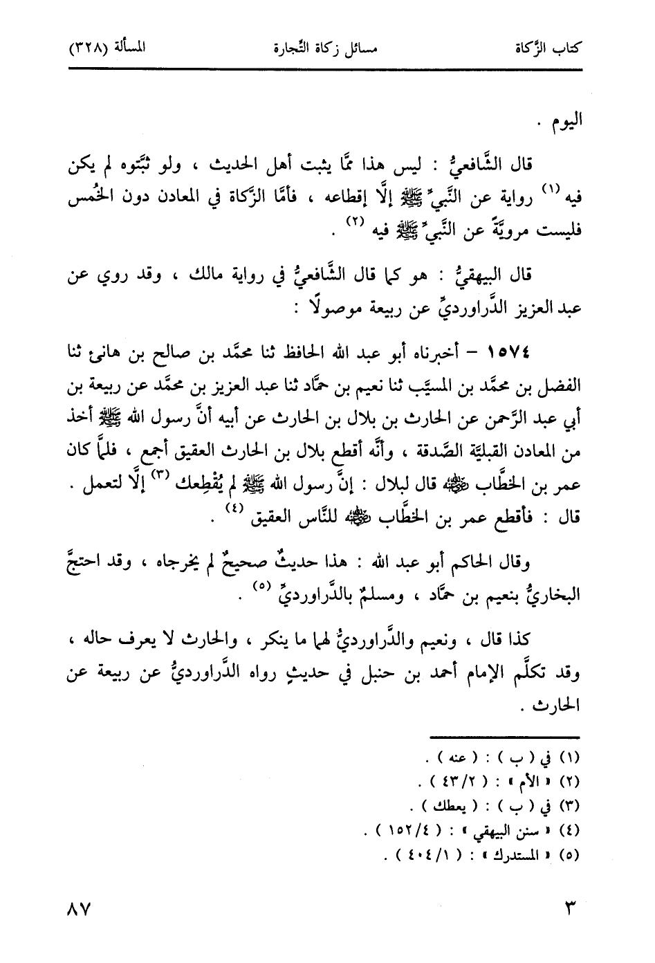 1574 - أخبرناه أبو عبد الله الحافظ ثنا محمَّد بن صالح بن هانئ ثنا الفضل بن محمَّد بن المسيَّب ثنا نعيم بن حمَّاد ثنا عبد العزيز بن محمَّد عن ربيعة بن أبي عبد الرَّحمن عن الحارث بن بلال بن الحارث عن أبيه أنَّ رسول الله صَلَّى اللَّهُ عَلَيْهِ وَسَلَّمَ أخذ من المعادن القبليَّة الصَّدقة، وأنَّه أقطع بلال بن الحارث العقيق أجمع، فلمَّا كان عمر بن الخطَّاب رضي الله عنه قال لبلال: إنَّ رسول الله صَلَّى اللَّهُ عَلَيْهِ وَسَلَّمَ لم يُقْطِعك (3) إلا لتعمل.