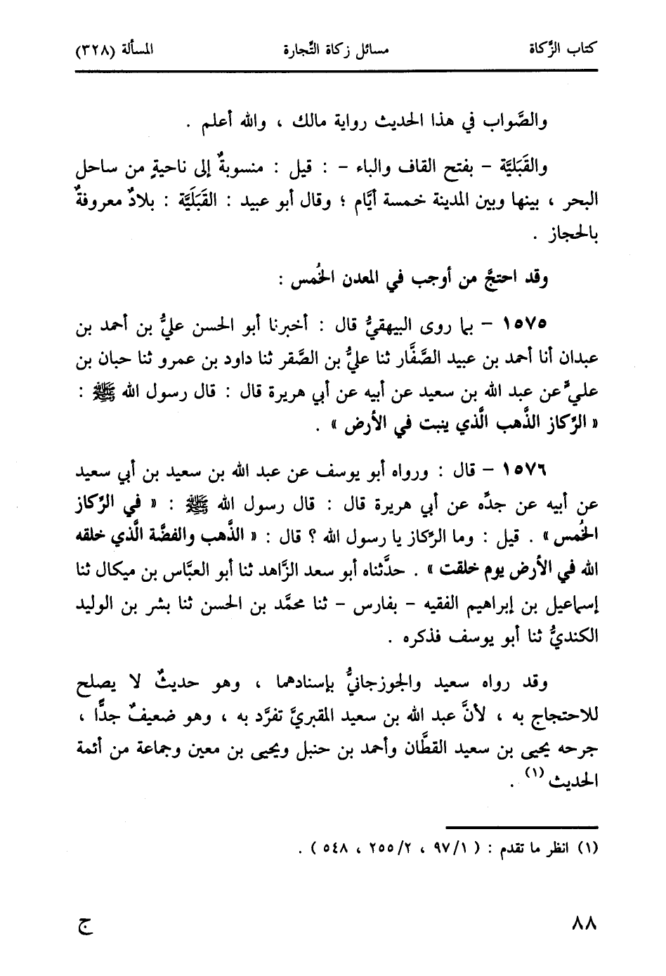 1575 - بما روى البيهقيُّ قال: أخبرنا أبو الحسن عليُّ بن أحمد بن عبدان أنا أحمد بن عبيد الصَّفَّار ثنا عليُّ بن الصَّقر ثنا داود بن عمرو ثنا حبان بن عليٍّ عن عبد الله بن سعيد عن أبيه عن أبي هريرة قال: قال رسول الله صَلَّى اللَّهُ عَلَيْهِ وَسَلَّمَ: " الرِّكاز الذَّهب الَّذي ينبت في الأرض ".
