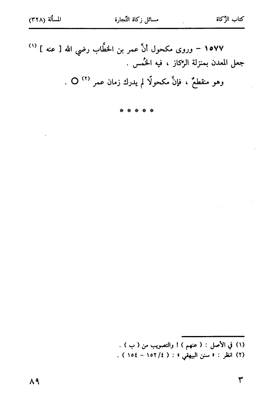 1577 - وروى مكحول أنَّ عمر بن الخطَّاب رضي الله [عنه] (1) جعل المعدن بمنزلة الرِّكاز، فيه الخُمس.