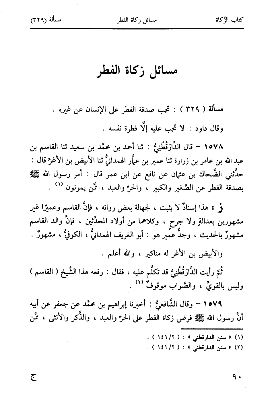 1578 - قال الدَّارَقُطْنِيُّ: ثنا أحمد بن محمَّد بن سعيد ثنا القاسم بن عبد الله بن عامر بن زرارة ثنا عمير بن عمَّار الهمدانيُّ ثنا الأبيض بن الأغرِّ قال: حدَّثني الضَّحاك بن عثمان عن نافع عن ابن عمر قال: أمر رسول الله صَلَّى اللَّهُ عَلَيْهِ وَسَلَّمَ بصدقة الفطر عن الصَّغير والكبير، والحرِّ والعبد، ممَّن يمونون (1).
