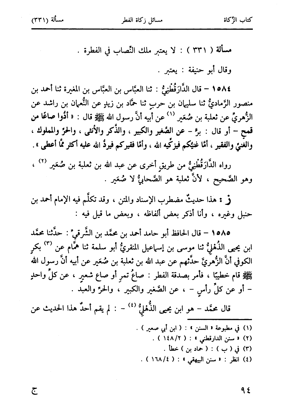 رواه الدَّارَقُطْنِيُّ من طريقٍ أخرى عن عبد الله بن ثعلبة بن صُعَير (2)، وهو الصَّحيح، لأنَّ ثعلبة هو الصَّحابيُّ لا صُعَير.