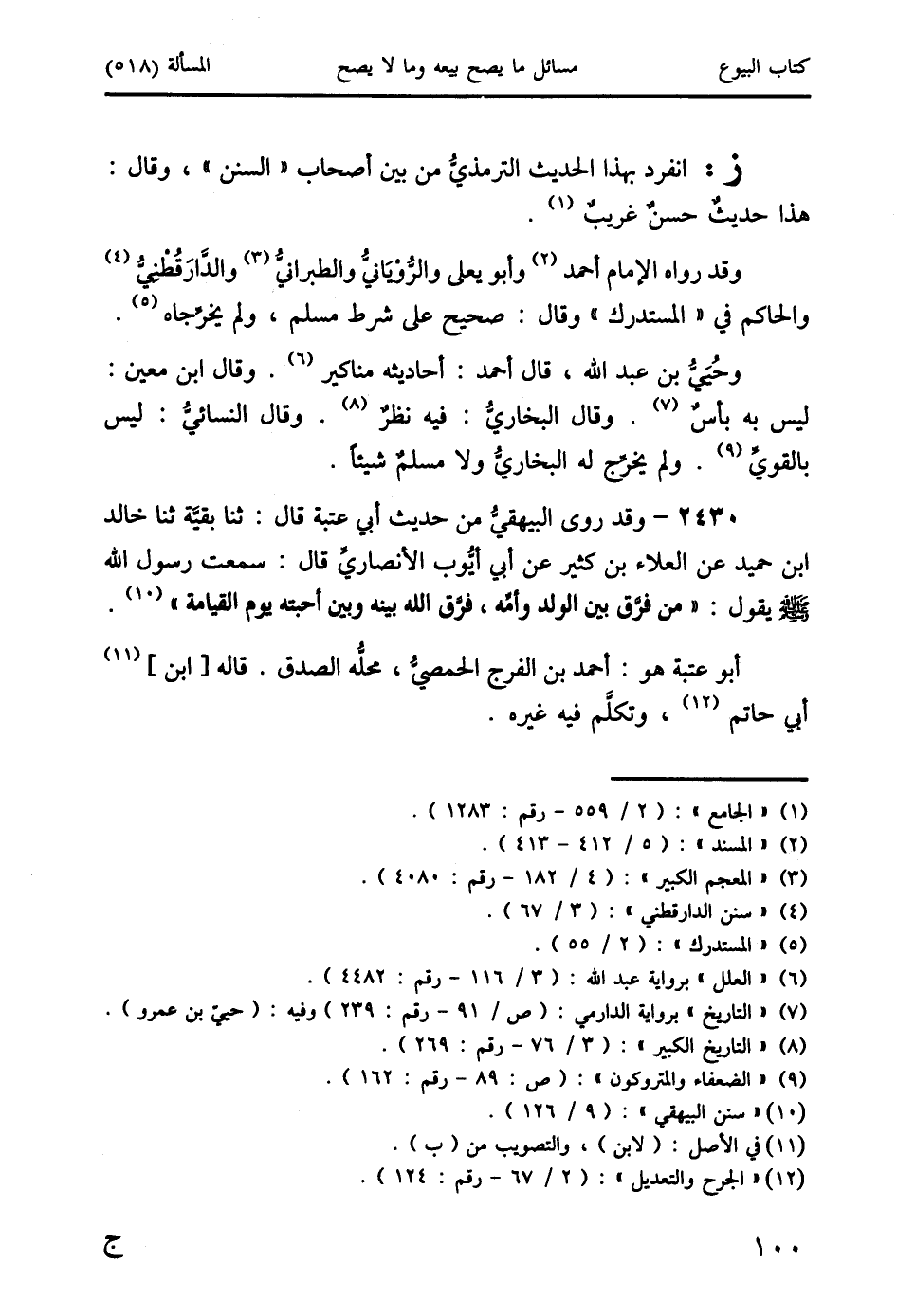 2430 - وقد روى البيهقيُّ من حديث أبي عتبة قال: ثنا بقيَّة ثنا خالد ابن حميد عن العلاء بن كثير عن أبي أيُّوب الأنصاريِّ قال: سمعت رسول الله صَلَّى اللَّهُ عَلَيْهِ وَسَلَّمَ يقول: " من فرَّق بين الولد وأمِّه، فرَّق الله بينه وبين أحبته يوم القيامة " (10).