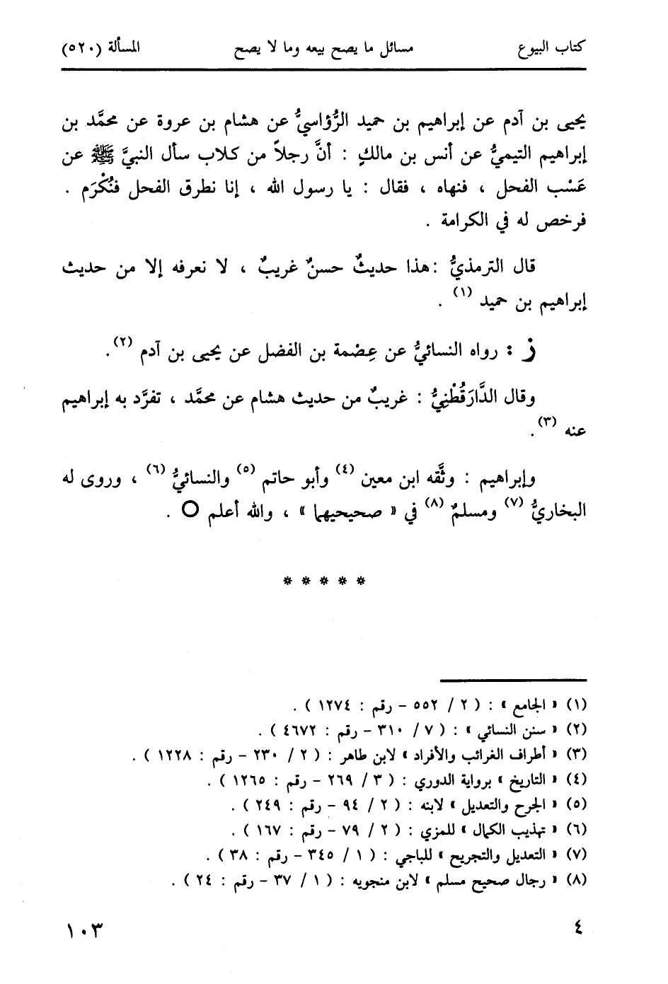 يحيى بن آدم عن إبراهيم بن حميد الرُّؤاسيُّ عن هشام بن عروة عن محمَّد بن إبراهيم التيميُّ عن أنس بن مالكٍ: أنَّ رجلاً من كلاب سأل النبيَّ صَلَّى اللَّهُ عَلَيْهِ وَسَلَّمَ عن عَسْب الفحل، فنهاه، فقال: يا رسول الله، إنا نطرق الفحل فنُكْرَم.