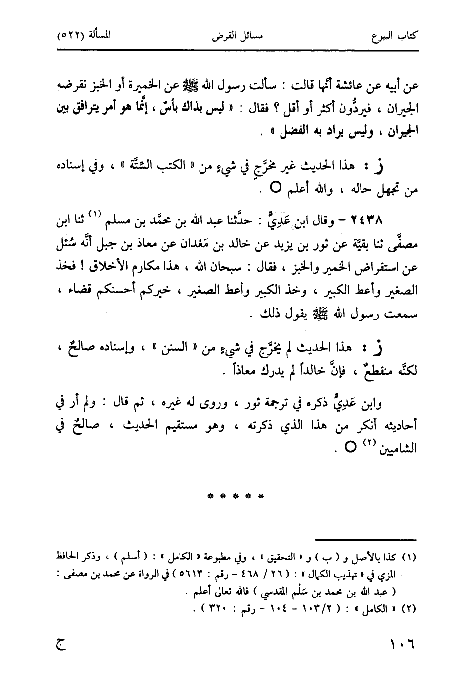 2438 - وقال ابن عَدِيٍّ: حدَّثنا عبد الله بن محمَّد بن مسلم (1) ثنا ابن مصفَّى ثنا بقيَّة عن ثور بن يزيد عن خالد بن مَعْدان عن معاذ بن جبل أنَّه سُئل عن استقراض الخمير والخبز، فقال: سبحان الله، هذا مكارم الأخلاق! فخذ