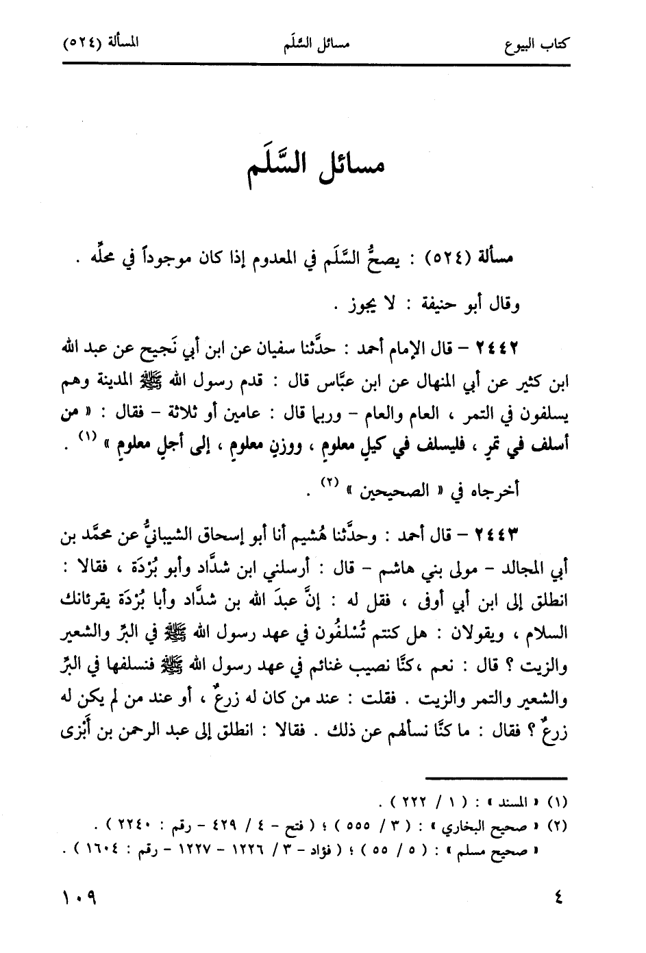 2443 - قال أحمد: وحدَّثنا هُشيم أنا أبو إسحاق الشيبانيُّ عن محمَّد بن أبي المجالد- مولى بني هاشم- قال: أرسلني ابن شدَّاد وأبو بُرْدَة، فقالا: انطلق إلى ابن أبي أوفى، فقل له: إنَّ عبدَ الله بن شدَّاد وأبا بُرْدَة يقرئانك السلام، ويقولان: هل كنتم تُسْلفُون في عهد رسول الله صَلَّى اللَّهُ عَلَيْهِ وَسَلَّمَ في البرِّ والشعير والزيت؟ قال: نعم، كنَّا نصيب غنائم في عهد رسول الله صَلَّى اللَّهُ عَلَيْهِ وَسَلَّمَ فنسلفها في البرِّ والشعير والتمر والزيت. فقلت: عند من كان له زرعٌ، أو عند من لم يكن له زرعٌ؟ فقال: ما كنَّا نسألهم عن ذلك. فقالا: انطلق إلى عبد الرحمن بن أَبْزى