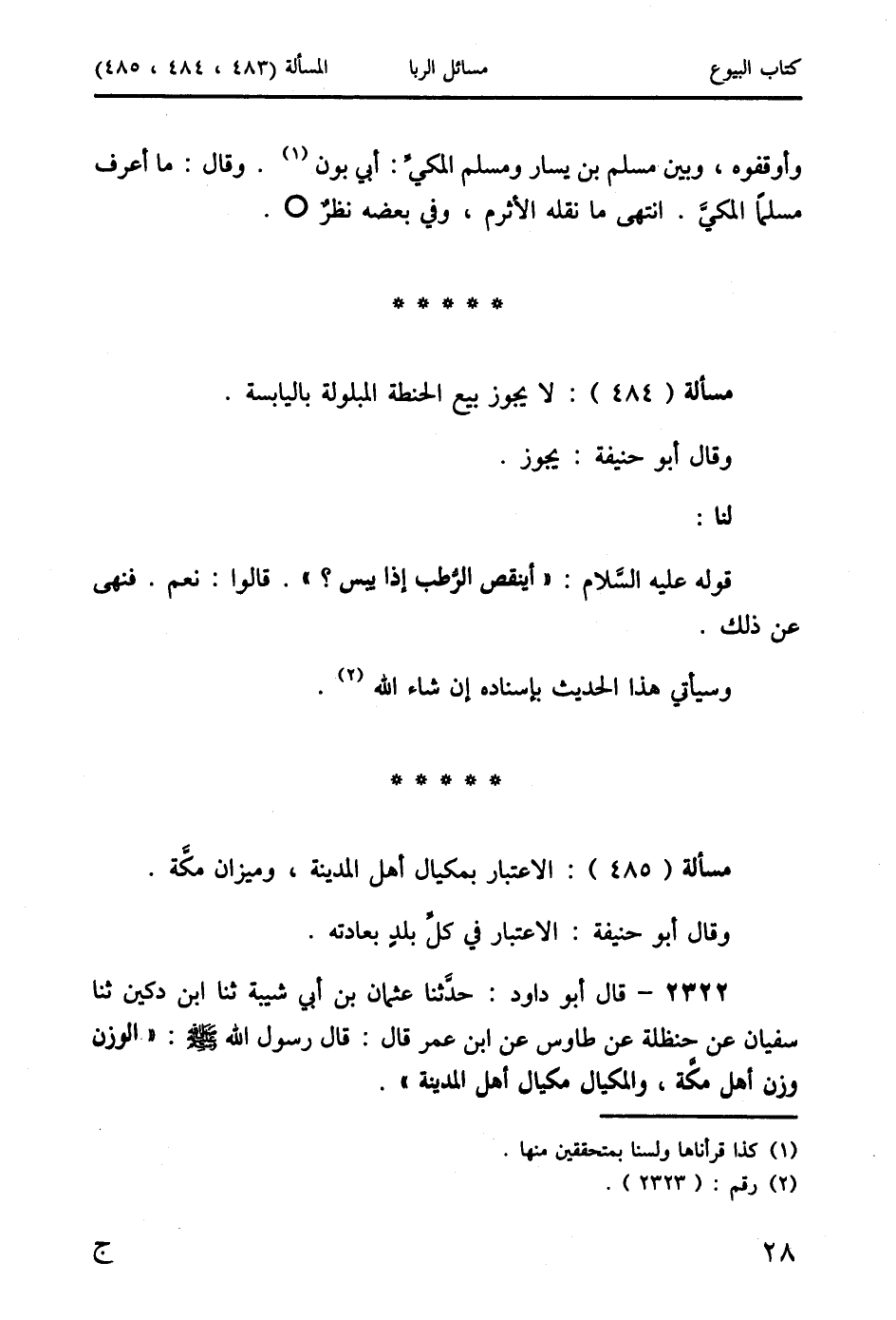 2322 - قال أبو داود: حدَّثنا عثمان بن أبي شيبة ثنا ابن دكين ثنا سفيان عن حنظلة عن طاوس عن ابن عمر قال: قال رسول الله صَلَّى اللَّهُ عَلَيْهِ وَسَلَّمَ: " الوزن وزن أهل مكَّة، والمكيال مكيال أهل المدينة ".