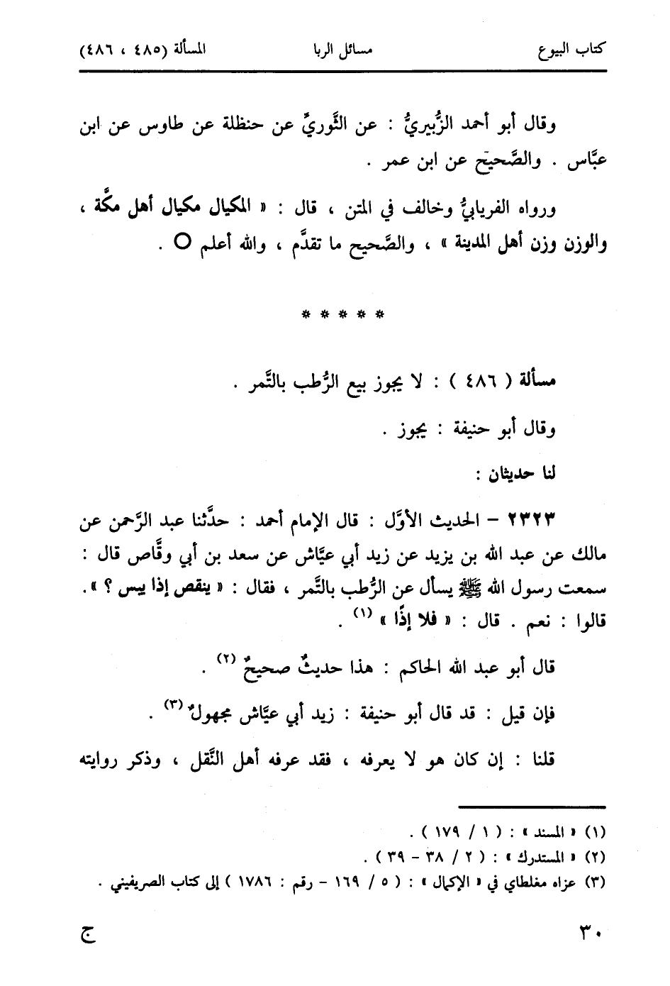 2323 - الحديث الأوَّل: قال الإمام أحمد: حدَّثنا عبد الرَّحمن عن مالك عن عبد الله بن يزيد عن زيد أبي عيَّاش عن سعد بن أبي وقَّاص قال: سمعت رسول الله-صَلَّى اللَّهُ عَلَيْهِ وَسَلَّمَ يسأل عن الرُّطب بالتَّمر، فقال: " ينقص إذا يبس؟ ".