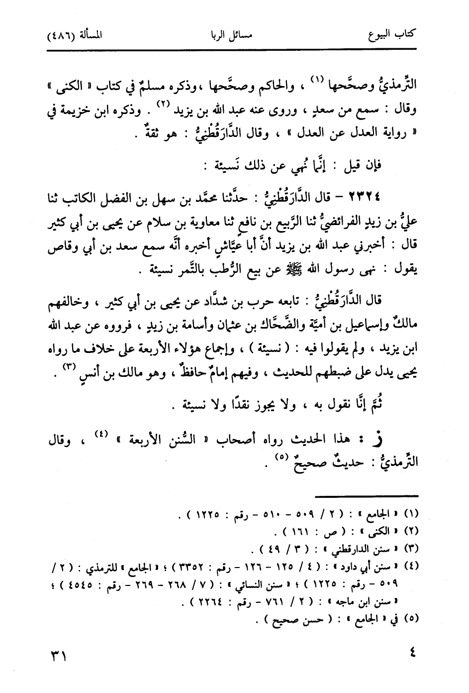 (4) "سنن أبي داود": (4/ 125 - 126 - رقم: 3352)؛ "الجامع" للترمذي: (2/ 509 - رقم: 1225)؛ "سنن النسائي": (7/ 268 - 269 - رقم: 4545)؛ "سنن ابن ماجة": (2/ 761 - رقم: 2264).