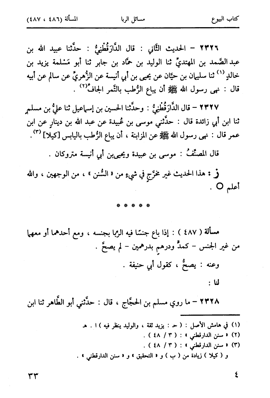 2327 - قال الدَّارَقُطْنِيُّ: وحدَّثنا الحسين بن إسماعيل ثنا عليُّ بن مسلمٍ ثنا ابن أبي زائدة قال: حدَّثني موسى بن عُبيدة عن عبد الله بن دينارٍ عن ابن عمر قال: نهى رسول الله- صَلَّى اللَّهُ عَلَيْهِ وَسَلَّمَ عن المزابنة، أن يباع الرُّطب باليابس [كيلا] (3).
