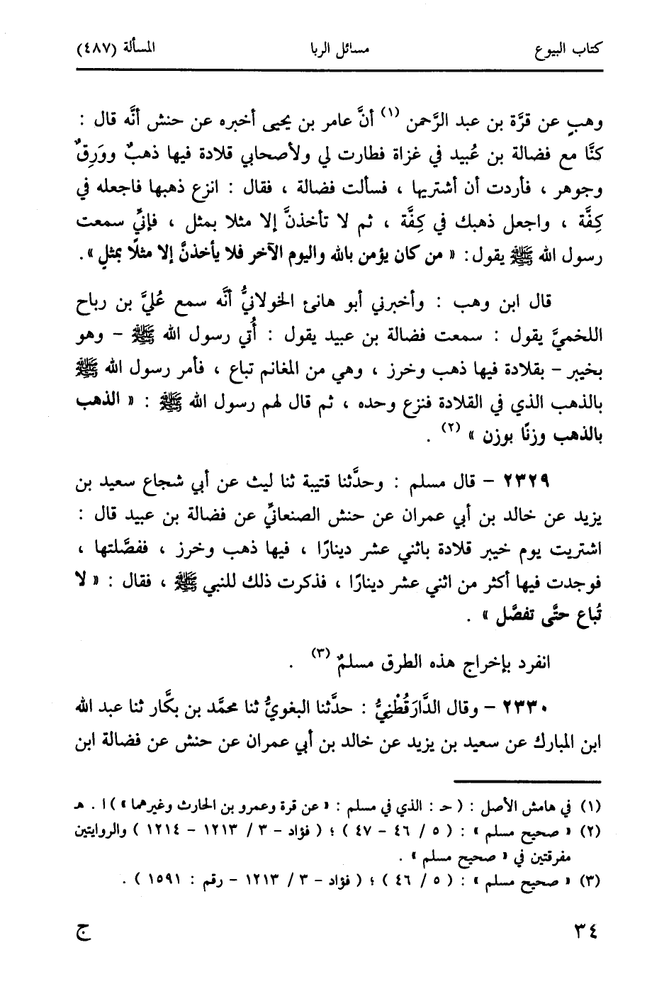 2329 - قال مسلم: وحدَّثنا قتيبة ثنا ليث عن أبي شجاع سعيد بن يزيد عن خالد بن أبي عمران عن حنش الصنعانيِّ عن فضالة بن عبيد قال: اشتريت يوم خيبر قلادة باثني عشر دينارًا، فيها ذهب وخرز، ففصَّلتها، فوجدت فيها أكثر من اثني عشر دينارًا، فذكرت ذلك للنبي صَلَّى اللَّهُ عَلَيْهِ وَسَلَّمَ، فقال: " لا تُباع حتَّى تفصَّل ".