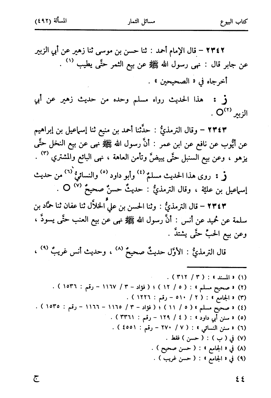 2342 - قال الإمام أحمد: ثنا حسن بن موسى ثنا زهير عن أبي الزبير عن جابر قال: نهى رسول الله صَلَّى اللَّهُ عَلَيْهِ وَسَلَّمَ عن بيع الثمر حتَّى يطيب (1).